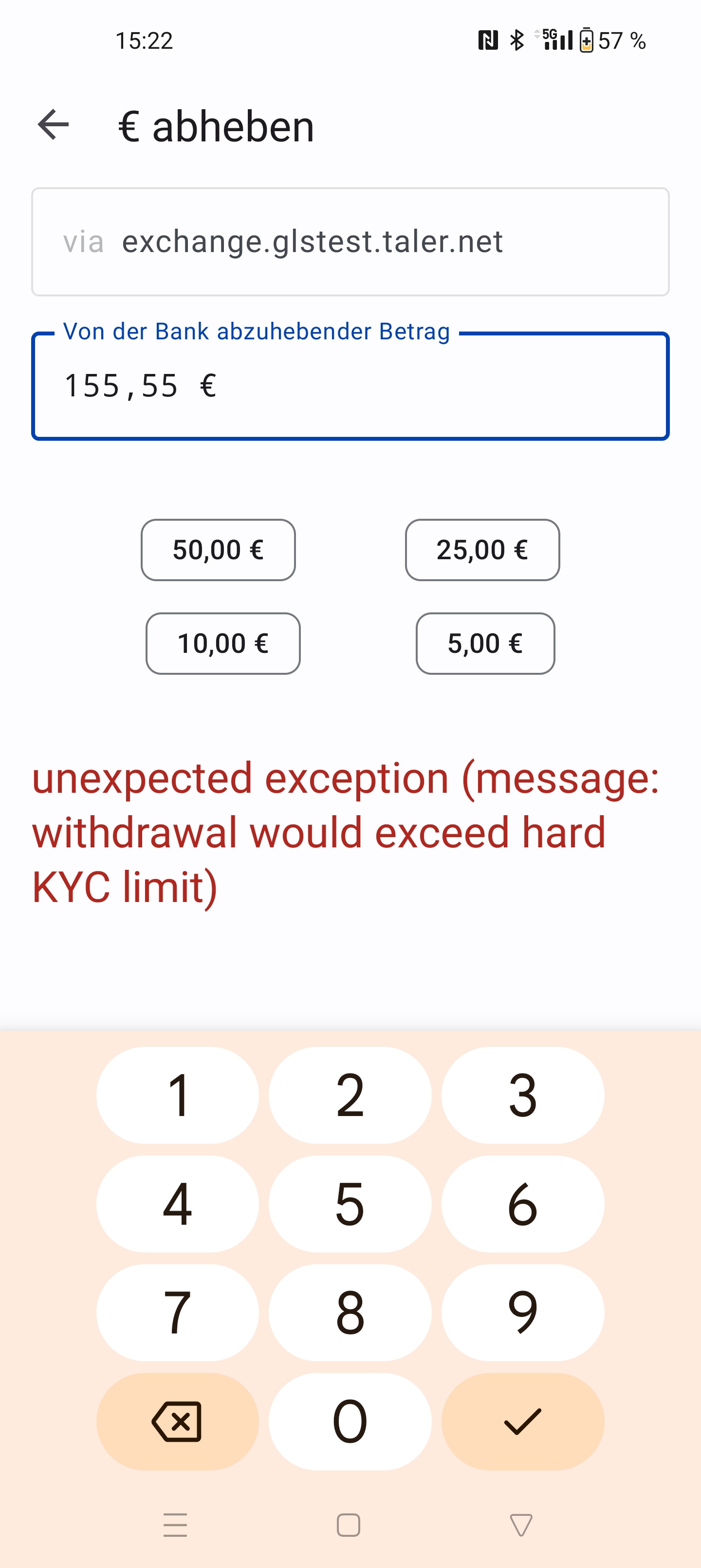 | Description | Aktueller Text: unexpeted exception (message: Withdrawaö would exceed hard limit) Neuer TexT: In der Taler können aus aufsichtsrechtlichen Gründen nur 150 EUR aufgeladen/gespeichert werden. | ||||