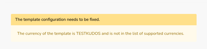 Well, what happened was that we had the backend configured to the KUDOS default, and then fixed that to CHF (at real merchant) *after* we noticed that the currency was wrong in the template. Anyway, a related issue is that currently the backend SPA doesn't allow creating templates with non-default currencies, despite the backend actually being multi-currency capable. But we probably should make that a separate less urgent issue. That said, if you instead just allow the user to select the template currency and ONLY allow submitting templates with any of the actually enabled currencies, that'd be ideal. That way, an update would force us right into one of the supported currencies, and we'd address this specific multi-currency issue. |
