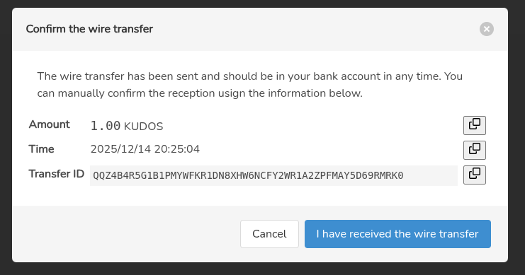 | Description | As of the fix from 0009454, it is now possible to get a list of the expected incoming wire transfers. In the "Transfers" dialog, we should have a way to list not only the confirmed transfers (as right now), but also the (unconfirmed) "incoming"/expected wire transfers. For those, there should be a button to "confirm" them, turning them into confirmed transfers by POSTing the data to /transfer. That way, if taler-merchant-wirewatch is not available, merchants can still easily do the reconciliation without lots of typing. Also note that 0009454 makes various small changes/deprecations to the GET /private/transfer endpoint which should be reflected in the transfer list (such as new filters on validated and confirmed). | ||||