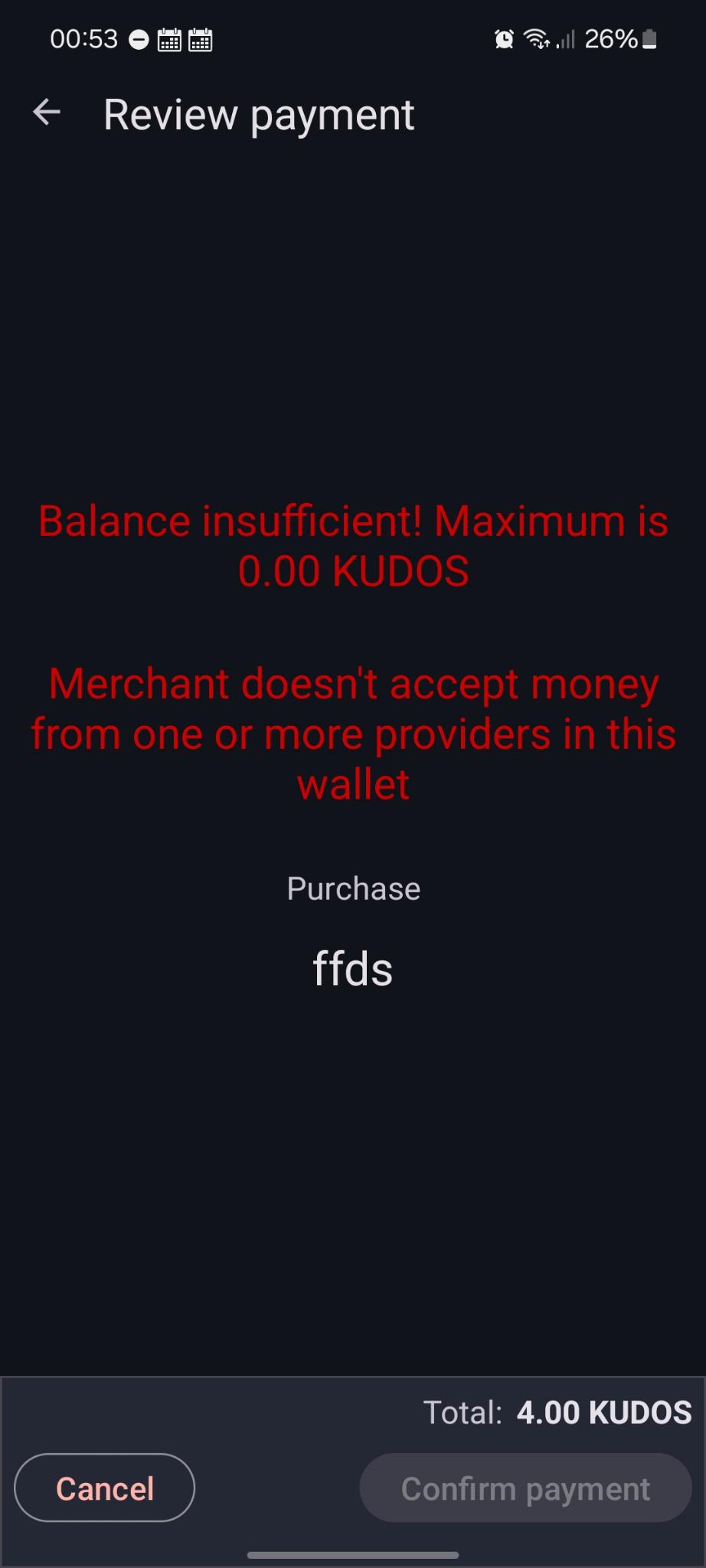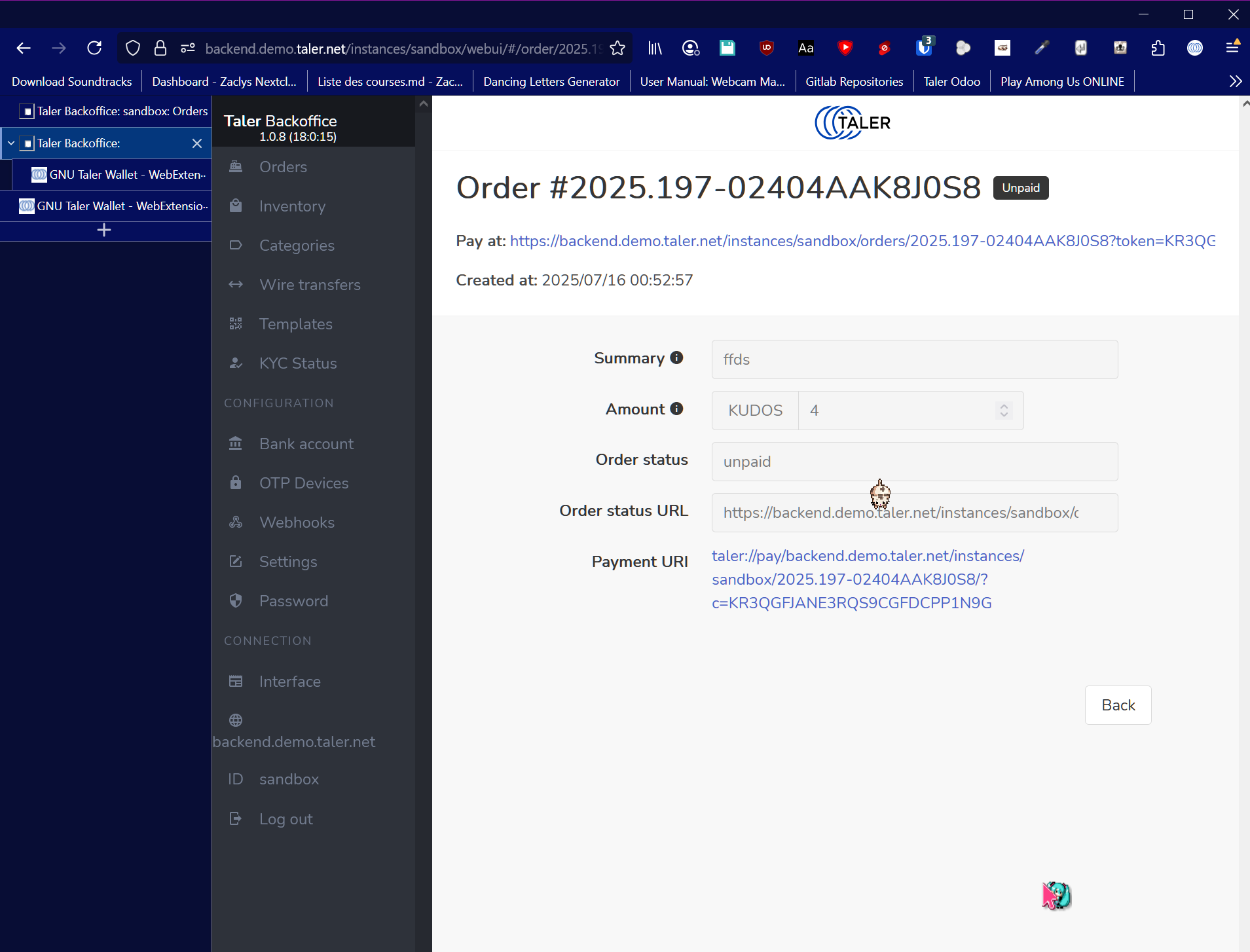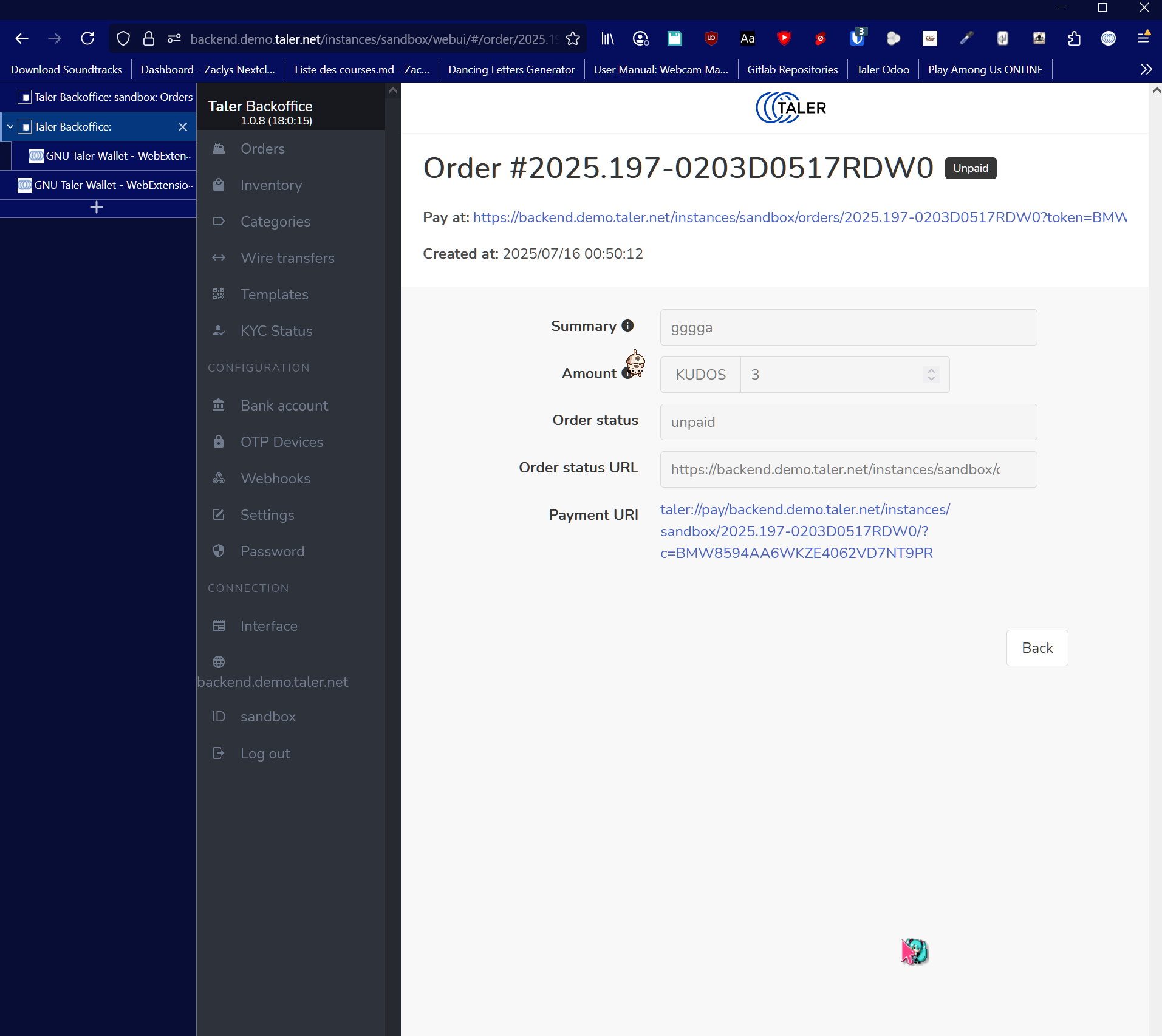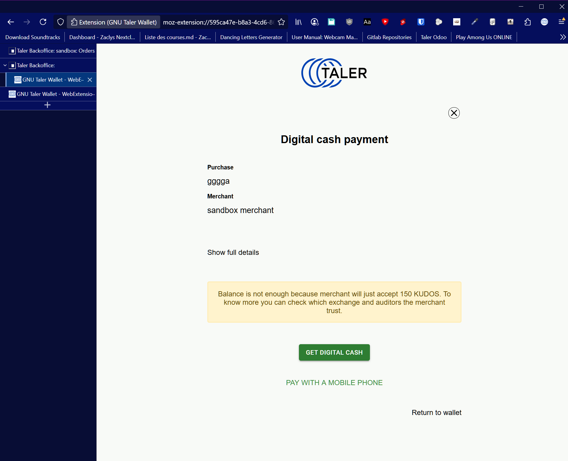 | Description | Hi, I am working with the Taler test database https://backend.demo.taler.net/instances/sandbox When I place an order using the big blue "+" button, and I try to pay using either the Android app wallet or the Firefox add-on wallet, I receive errors and the payment doesn't go through For the Firefox add-on wallet, I have 150 KUDOS on it. I just placed this order `https://backend.demo.taler.net/instances/sandbox/webui/#/order/2025.197-0203D0517RDW0/details` When trying to pay, I get a yellow error message saying `Balance is not enough because merchant will just accept 150 KUDOS. To know more you can check which exchange and auditors the merchant trust.` (screenshots attached for Order1) For the android app, I have 50 KUDOS on it. I just placed this order `https://backend.demo.taler.net/instances/sandbox/webui/#/order/2025.197-02404AAK8J0S8/details` When trying to pay, I get a red error message saying `Balance insufficient! Maximum is 0.00 KUDOS. Merchant doesn't accept money from one or more providers in this wallet.` (screenshots attached for Order2) I also tried placing an order using a direct POST request, instead of using the big blue "+" button, but it didn't change the outcome. For context, I am developping an add-on for Odoo to implement the Taler payment system, and I would like to test a simple transfer completion, but it isn't working for me. | ||||