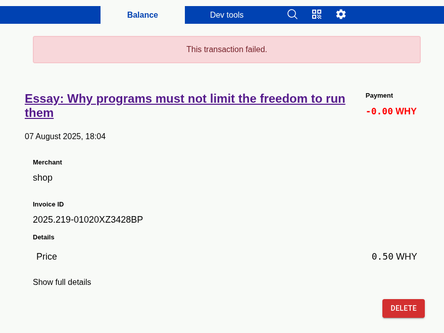 | Description | seen in the webextension 1) buy an article 2) remove the session 3) render the article repurchase will be triggered, a new transaction in the wallet is show with status = failed | ||||