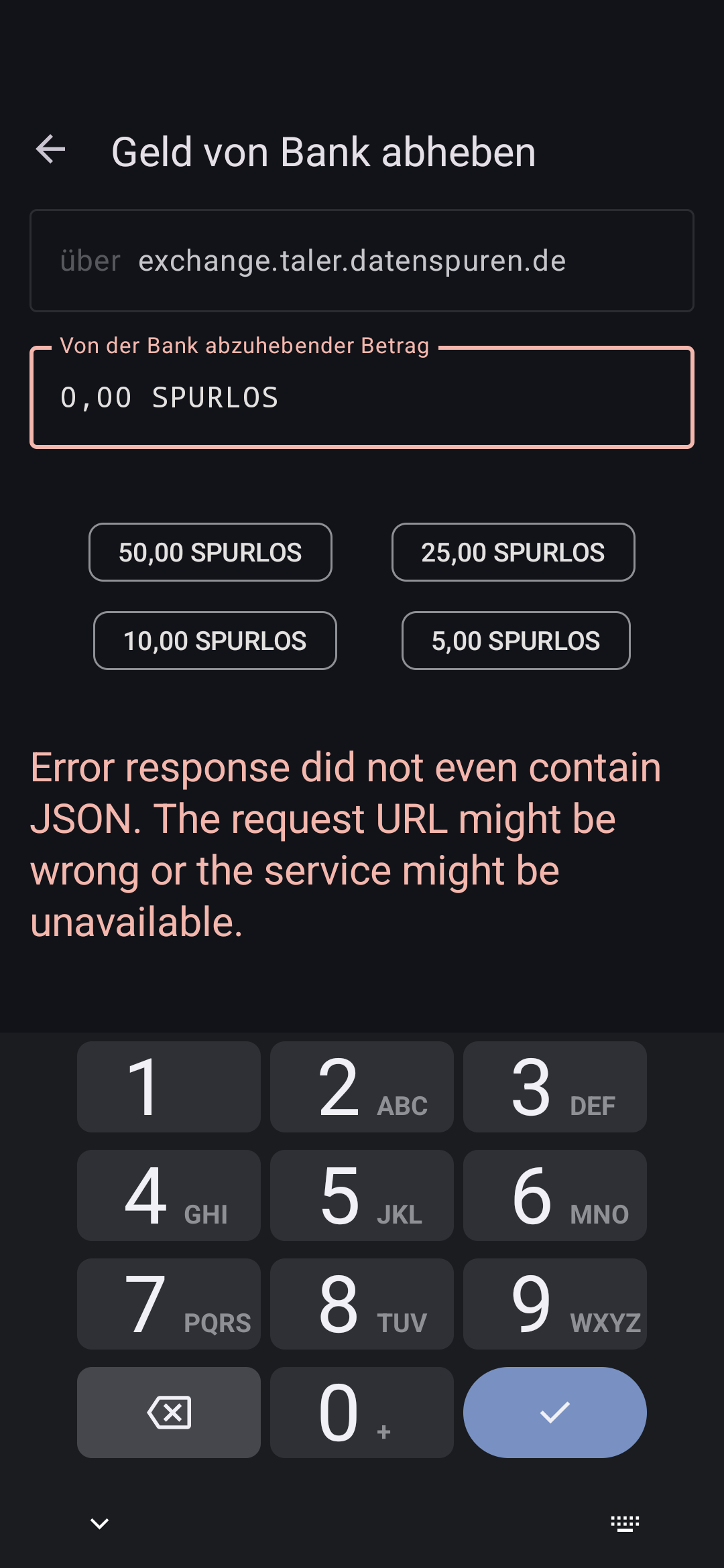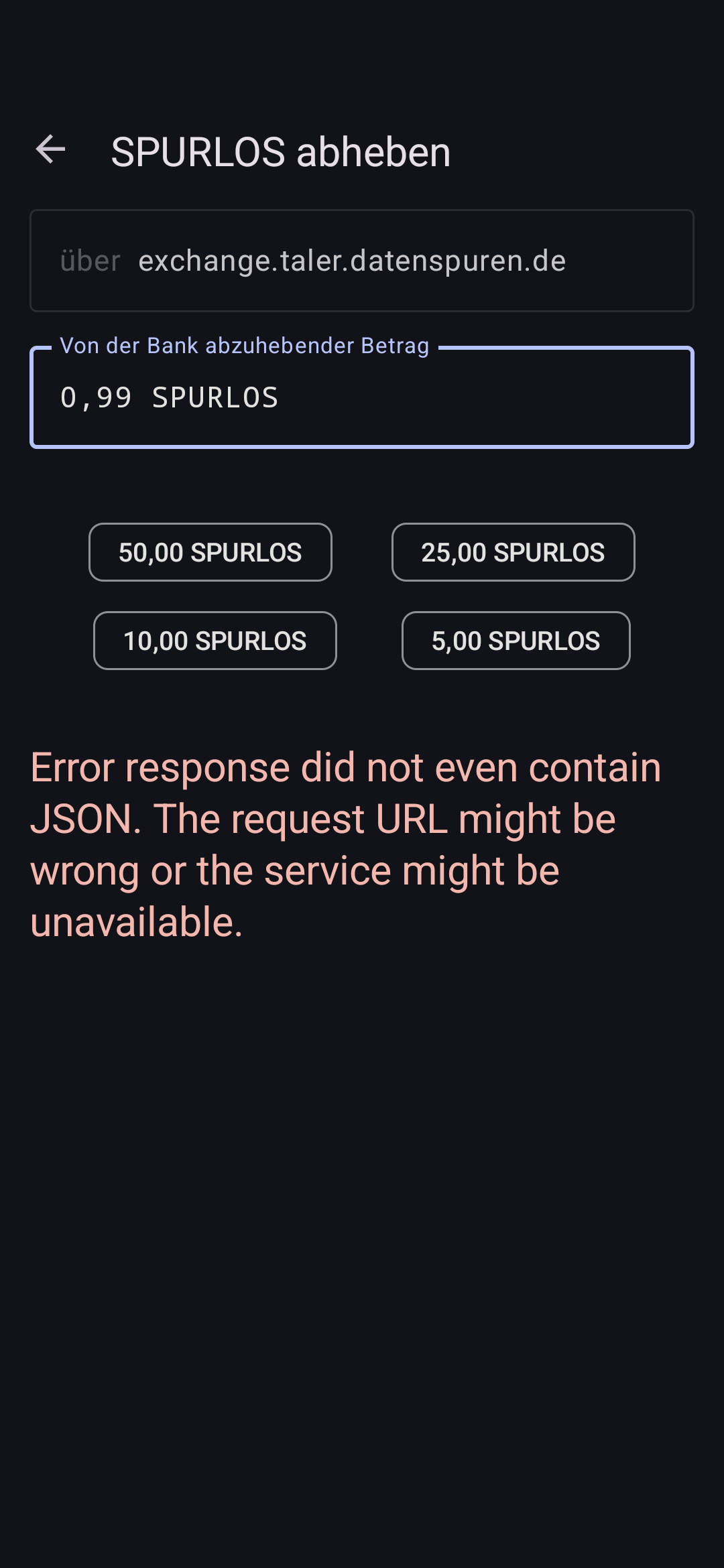 | Steps To Reproduce | 0. setup exchange.taler.datenspuren.de exchange (if it does not work as expected, see https://bugs.gnunet.org/view.php?id=10301) 1. tap on "withdraw" in the bottom sheet menu 2. see the form with an error saying "Error response did not even contain JSON. The request URL might be wrong or the service might be unavailable." 3. Although the numpad is shown, it is not possible to edit the amount 4. clicking on one of the preconfigured amounts shows a complete loading screen (also kind of unexpected, instead of showing a small loading animation on the button) 5. see that "confirm withdrawal" is now clickable, but don't click it yet 6. edit the amount to be any amount below 1 SPURLOS (0.99 for example) 7. See the same error message as above, being unable to withdraw such amounts | ||||