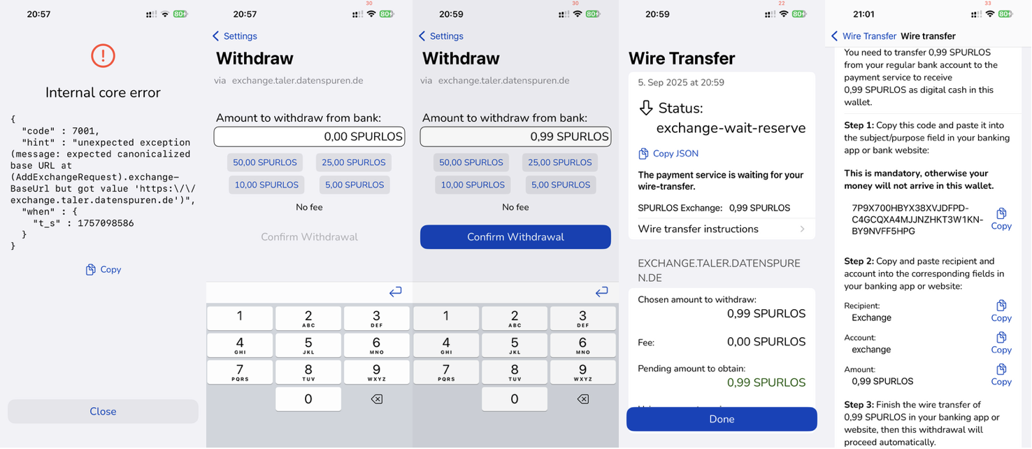 iOS: 0. setup exchange.taler.datenspuren.de exchange -> worked fine, however only after the user added a slash at the end. Without that slash, wallet-core returns an internal core error. 1. tap on "withdraw" in the bottom sheet menu 2. see the form with an error saying "Error response did not even contain JSON. The request URL might be wrong or the service might be unavailable." -> there was no error 3. Although the numpad is shown, it is not possible to edit the amount -> amount is editable 4. clicking on one of the preconfigured amounts shows a complete loading screen (also kind of unexpected, instead of showing a small loading animation on the button) 5. see that "confirm withdrawal" is now clickable, but don't click it yet 6. edit the amount to be any amount below 1 SPURLOS (0.99 for example) 7. See the same error message as above, being unable to withdraw such amounts -> works as it should |