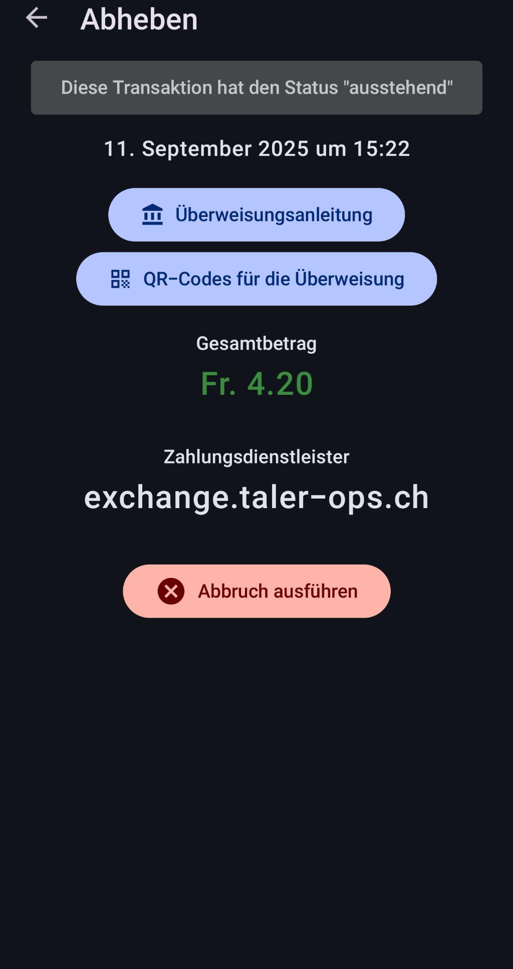 | Description | - PostFinance for Android Wallet v1.0.9 (google 65) - FKB for iOS Wallet v1.0.27 (core: v1.0.33) Time, 2025-09-11: ~12:30 Usually, for both banks the money arrives within the day inside Switzerland and at this time. In the case of PostFinance, it's even a local transfer. | ||||