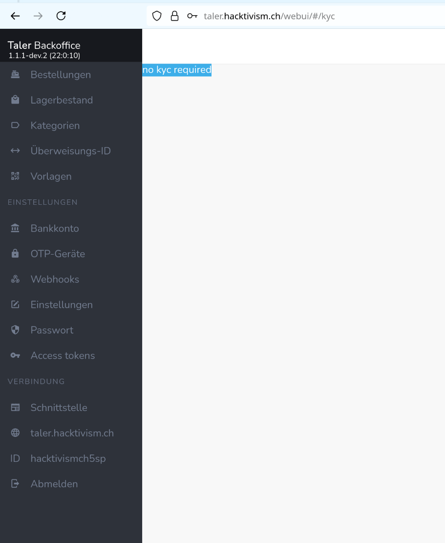 The current status for an instance on the Merchant Backoffice v1.1.1-dev.6 (23:1:11) is like seen on the attached image Twin_instance... The warning "Unable to reach the payment service provider, contact the system administrator or check again later." still persists since the first tests, before it was tested what happens it the kyccheck process was suppressed: See image No_KYC-required.png - no warning and no menu KYC Status appeared, just the line "No KYC required" showed up after login. |