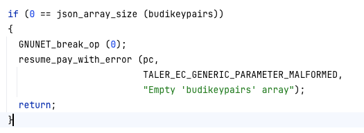 resume_pay_with_error is wrong in this place, as we're not actually suspended, so pay_end() must be used instead. I've fixed 2 other related places like this. Furthermore, I've modified the code to accept an empty budikeypair array. |