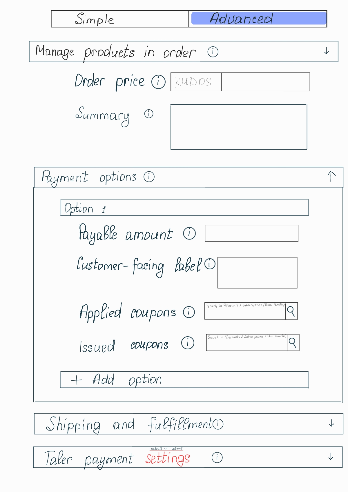 | Description | Here is a design idea for integrating token families into order creation. Also we need to rename "Taler payment options" to "Taler payment settings". For Templates I propose to locate "Payment options" under "Supported currencies" field. | ||||