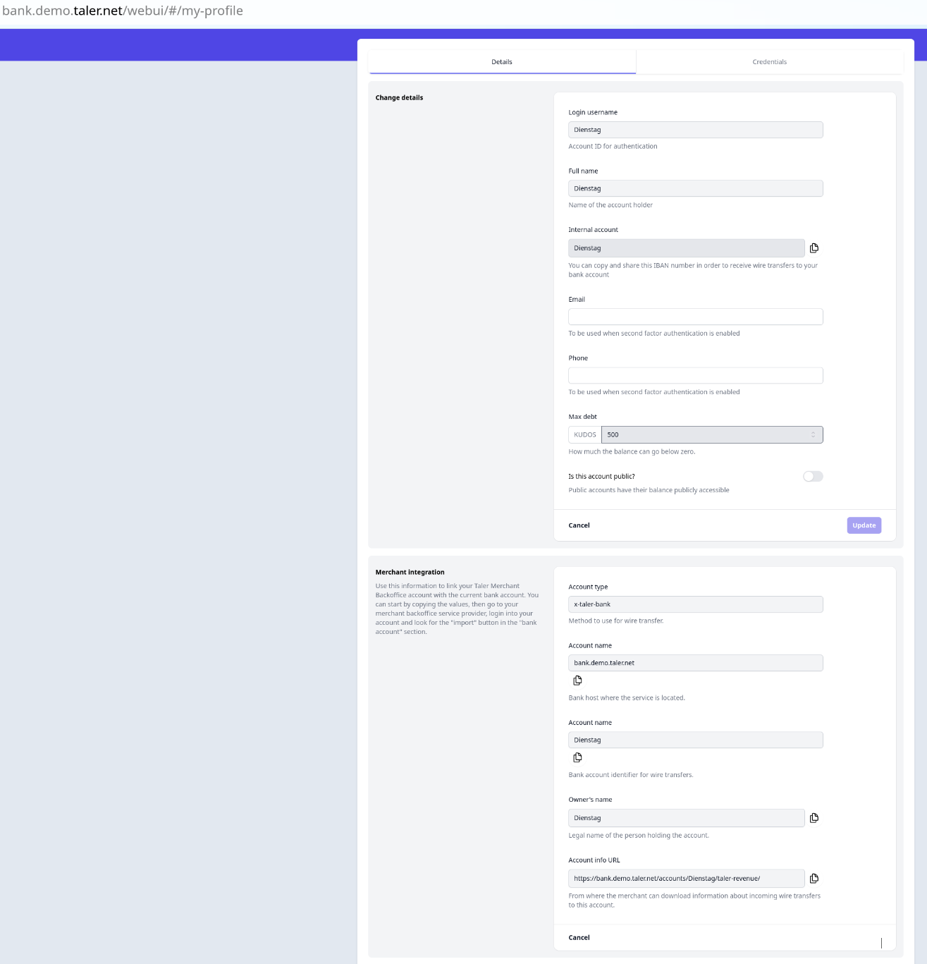 | Description | 1. The screen AccountForm in the Bank SPA https://bank.demo.taler.net/webui/#/my-profile must be simplified and sorted out what is really needed for the Merchant Backend to work --> to showcase what merchant users would normally do to link their bank accounts with the Merchant Backoffice UI 2. The string "You can copy and share this IBAN number in order to receive wire transfers to your bank account" (https://weblate.gnunet.org/translate/gnu-taler/taler-bank-spa/en/?checksum=7192a051d44ff57b) must be renamed to "The above data (e.g. IBAN, bank account descriptor) must be copied and pasted into the appropriate field of an online banking application for transfers." 3. The string "Internal account" (https://weblate.gnunet.org/translate/gnu-taler/taler-bank-spa/en/?checksum=5955cf9bded5af13) should be renamed to "Bank account number or account descriptor" | ||||