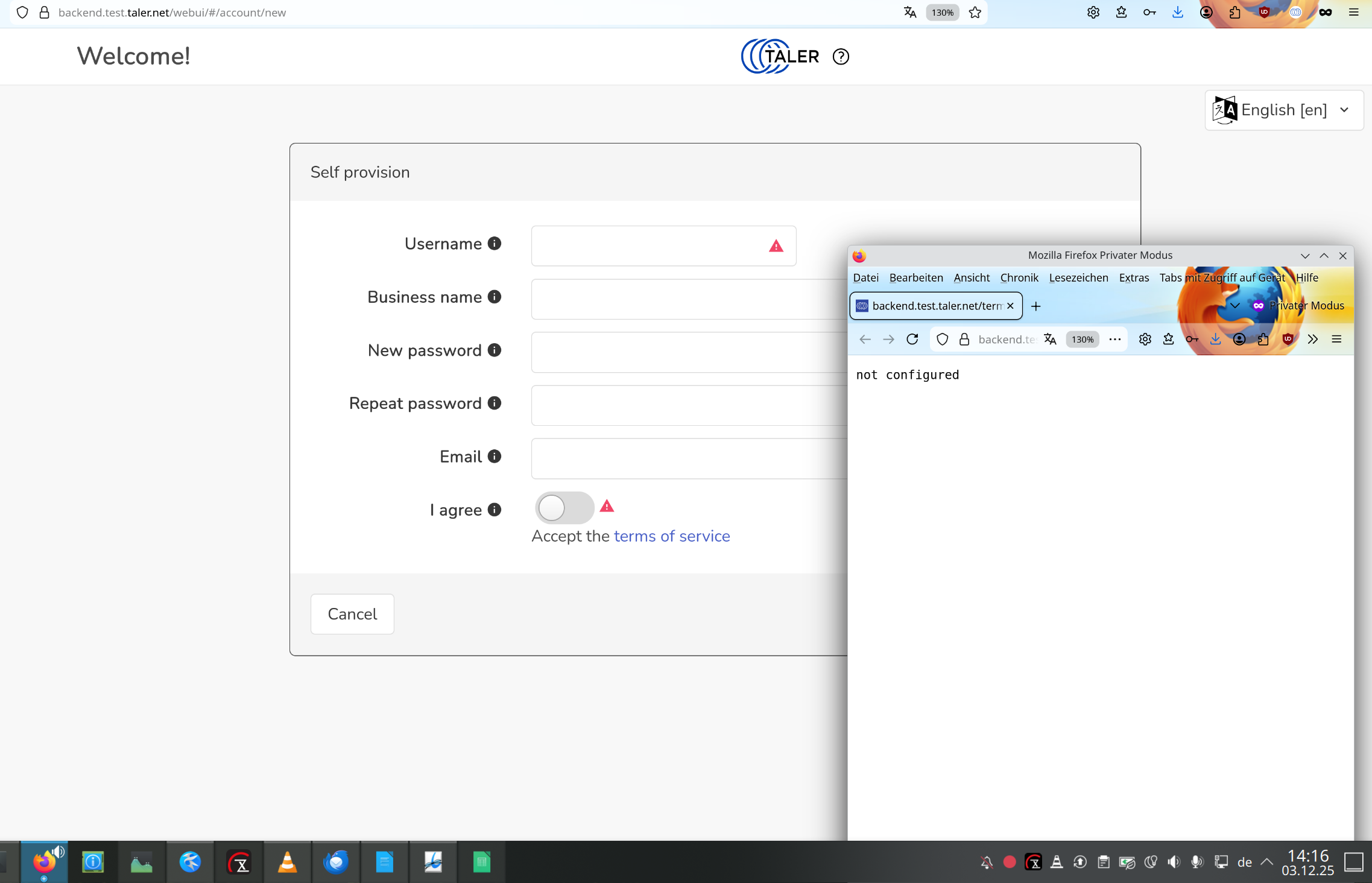 First, on https://backend.demo.taler.net and on https://backend.test.taler.net, Terms of service are still unavailable when you click on "Create new account". Second, CG in https://bugs.gnunet.org/view.php?id=10536#c26576 wrote "The latest merchant.git now has a new endpoint /terms and /privacy." - where is this, please? |