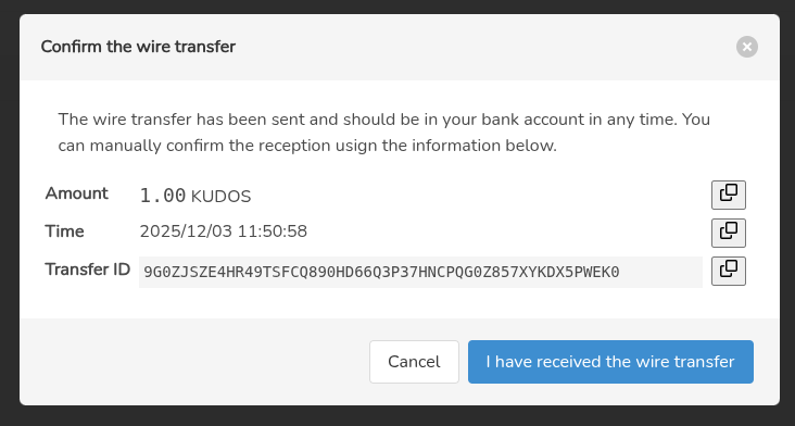| Description | when the wire transfer is manually confirmed it would be nice to show the exchange bank account number that is source of the wire transfer to the merchant not required, since the all the information is enough to identify it but some banks allows you to filter tx by account and it will make easier to find. I'm adding a screenshot of the dialog to confirm the wire transfer (this is draft version) | ||||