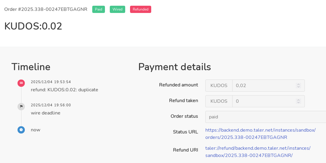| Steps To Reproduce | Create an order with short deadlines, pay it and create a refund, but DO NOT obtain the refund in the wallet. After the wire deadline passed refresh the browser view == Refund URL is still show. | ||||