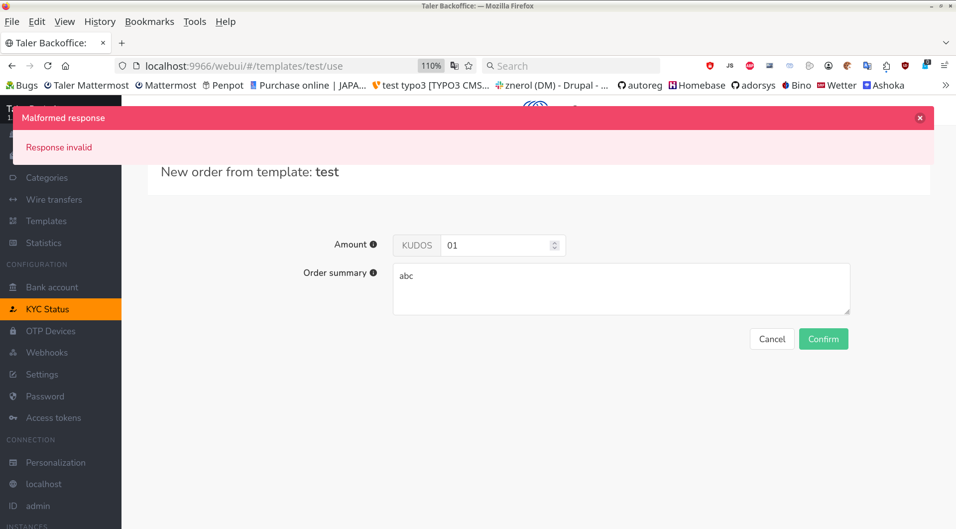 | Steps To Reproduce | Start with fresh merchant backend. Run taler-merchant-dbinit, and start ONLY taler-merchant-httpd. Create an instance. Create a bank account. Create a template. Use the template with the "Test" button. Set the amount to be > 1. Kaboom. | ||||
