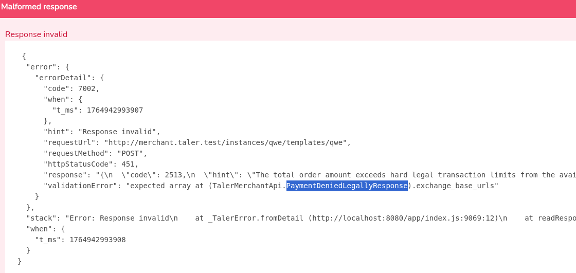 | Additional Information | Here, the exchange interaction (taler-merchant-kyccheck, taler-merchant-exchangekeyupdate) were deliberately not running, so the operation failed because no exchange was available to handle the amount. Now, I used an existing DB (didn't fully reset the DB), so maybe some additional steps _could_ be needed to get here, but I think the above is enough and in any case, 451 handling is the issue. | ||||
