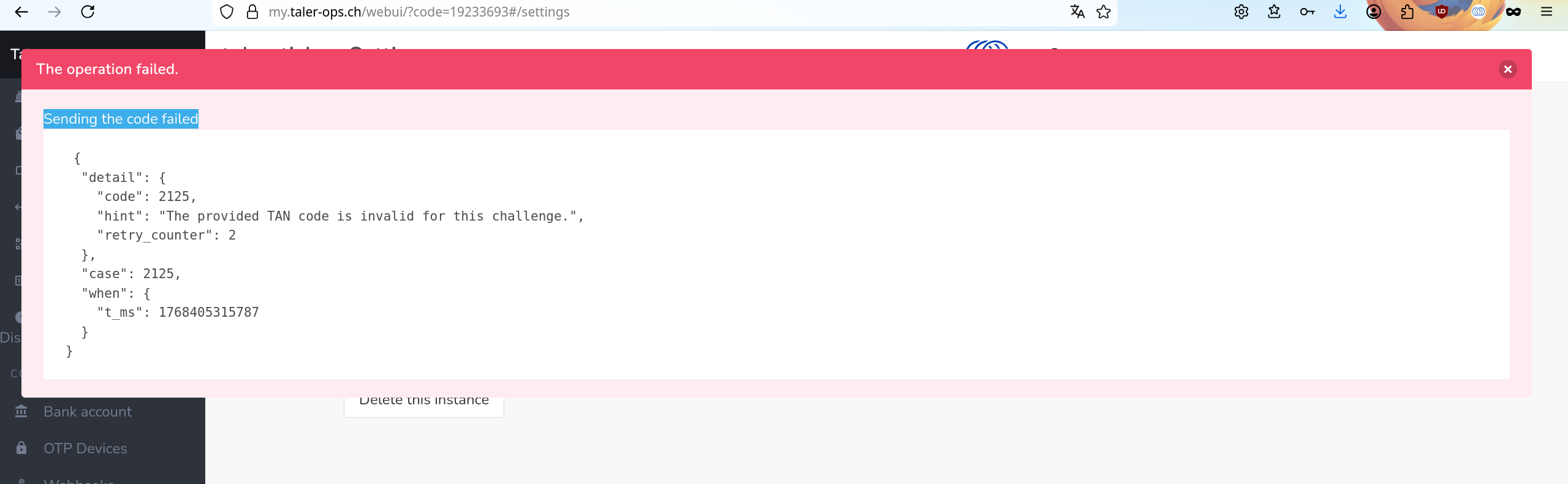 | Description | In the Merchant Backoffice SPA, applying for changing an email address or a password in the settings of Taler Merchant Backend (we tested v1.3.0) requires a user to enter the TAN code for verification. Given the current state, a user has to click or tap on the button "Enter" by the click of a mouse or a finger - and NOT just push the enter key on the keyboard as this will lead to an error message (see screenshot). We played through this situation in the Quality Checkpoint meeting on Jan 14 again after testing twice on different instances. This is clearly a bug that needs to be fixed rather sooner than later as people tend to enter numerical data on the numpad and press enter on the same, get an error message and leave the app in a frustrated state of mind (and maybe the payment system, too). | ||||