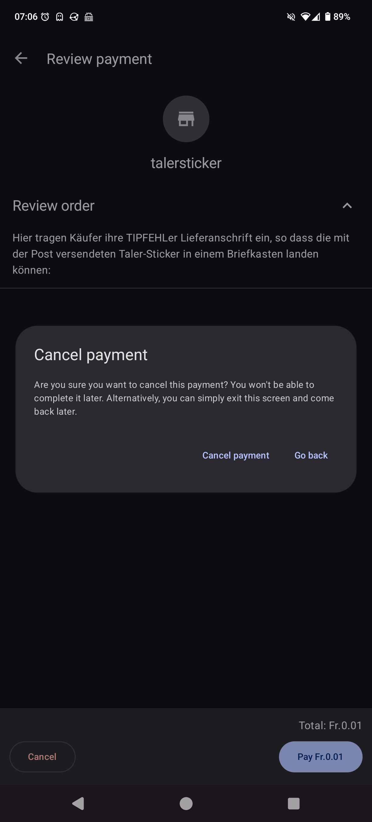 | Description | When using the "shop URL" taler://pay-template/my.taler-ops.ch/instances/talersticker/stickers and making an error in the form, it's not possible to go back from the review page and edit. The button "Go back" leads to the review page. "Cancel payment" stops the whole process and a "aborded" transaction is left. At least from my user perspective, nothing happened until that point and I would expect to be able to edit it and that there is no trace left if I cancel. But I suspect the app already calculated every thing at this point. | ||||