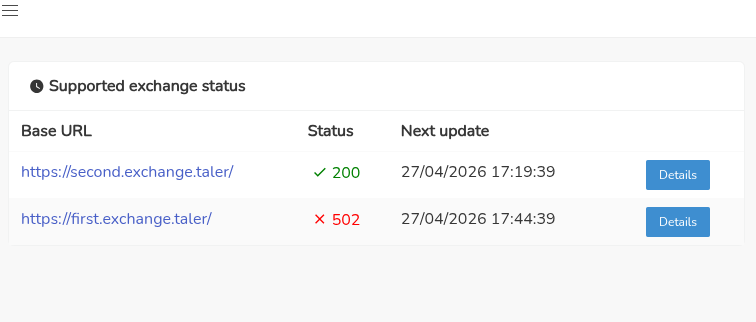 | Summary | 0011026: expand SPA with list of exchanges and status information from new /exchanges endpoint | ||||