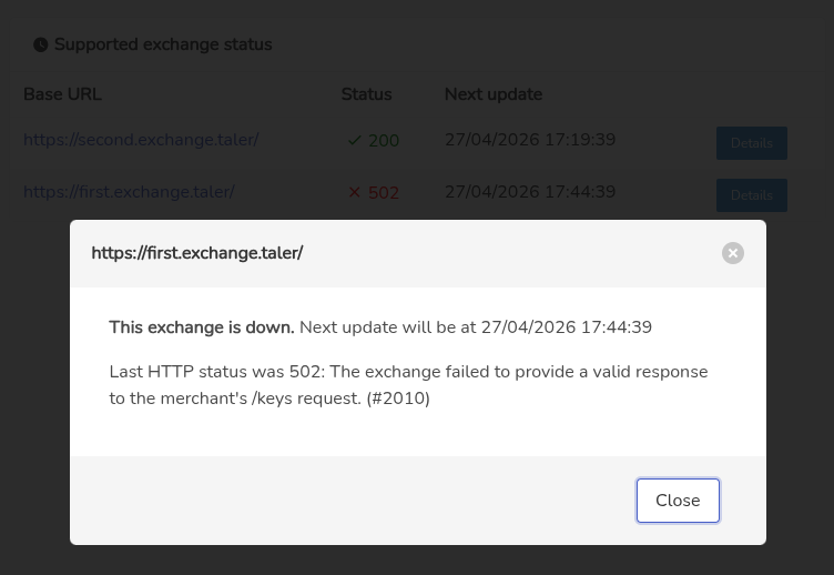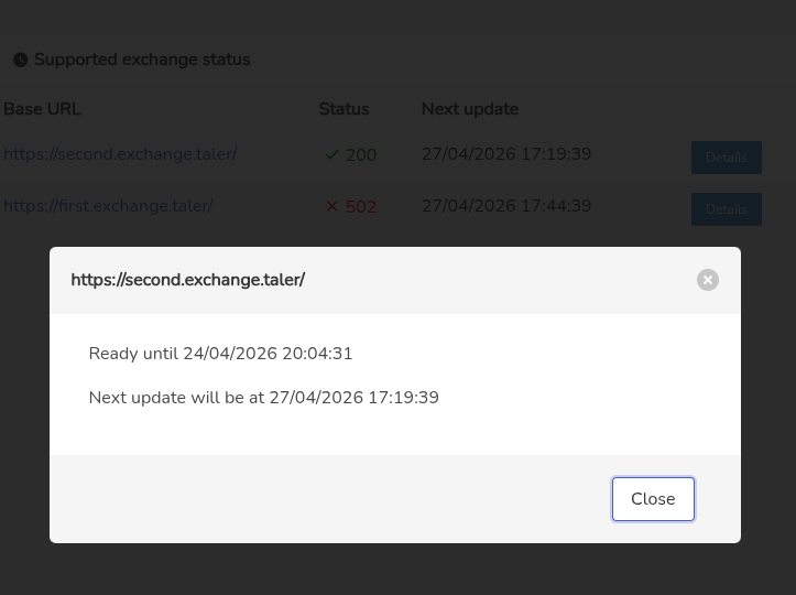 | Description | This should be visible in a menu item that is either shown in developer mode, *or* if there is an error with any of the configured exchanges -- or if it is empty (and then show a warning that it is empty). The endpoint includes a "next_download" timestamp. The SPA should probably fetch an updated "/exchanges" status shortly after (+5s?) the lowest "next_download" timestamp from the list, or say every 5 minutes (whatever is lower) to avoid staying outdated for too long (the request is pretty cheap). In the exchange list, we should mostly show the base URL and then either the status as "UP" or "DOWN". Additionally, there should be a hint (pop up or mouse-over?) on the status: if "UP" with the text "ready until $KEYS_EXPIRATION" and when "DOWN" -- with "Last HTTP status was $KEYS_HTTP_STATUS: $KEYS_HINT (#$KEYS_EC)". Anyway, at least that'd be my initial design, we can iterate later. | ||||