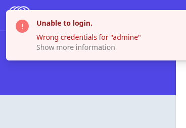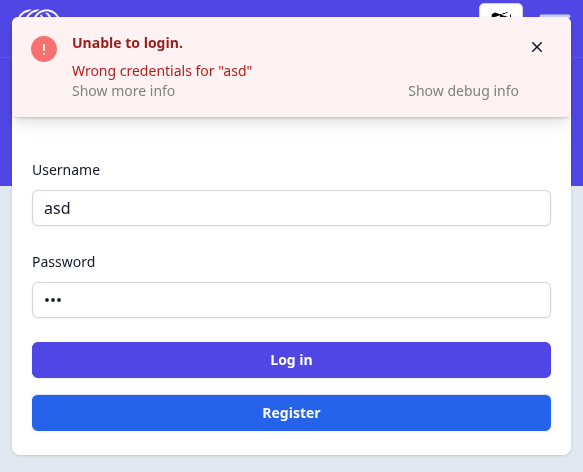 i changed the title, the description "wrong credentails" is in fact something correct based on the error code returned by the server. Based on the username you used a message "user not found" might be better but currently the server doesn't return a different code for that. |
