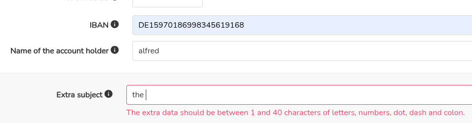we shouldn't trust him. This is the screen and this is the request produced curl 'https://merchant.taler/private/accounts' \ -H 'Accept: application/json' \ -H 'Accept-Language: en-US,en;q=0.9' \ -H 'Authorization: Bearer secret-token:MJ0MZ9BV27BK463Y2FX7WC4BR856MMZDG0VYQQVBAMJHVV3C9V80' \ -H 'Cache-Control: no-cache' \ -H 'Connection: keep-alive' \ -H 'Content-Type: application/json' \ -H 'Origin: https://dev.taler' \ -H 'Pragma: no-cache' \ -H 'Referer: https://dev.taler/' \ -H 'Sec-Fetch-Dest: empty' \ -H 'Sec-Fetch-Mode: cors' \ -H 'Sec-Fetch-Site: cross-site' \ -H 'Taler-Challenge-Ids: 72-TVRGPZSF95P9N24F4QHBHVVJ8A6X5AR1KR3CNYNDPXD097FNH21G' \ -H 'User-Agent: Mozilla/5.0 (X11; Linux x86_64) AppleWebKit/537.36 (KHTML, like Gecko) Chrome/139.0.0.0 Safari/537.36' \ -H 'sec-ch-ua: "Chromium";v="139", "Not;A=Brand";v="99"' \ -H 'sec-ch-ua-mobile: ?0' \ -H 'sec-ch-ua-platform: "Linux"' \ --data-raw '{"payto_uri":"payto://iban/DE15970186998345619168?receiver-name=alfred","extra_wire_subject_metadata":"THEend123"}' |