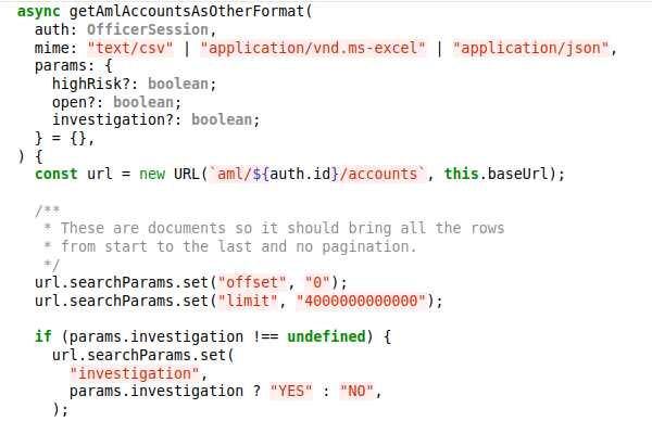 The exchange I have on exchange.git/master have the SPA Version 1.3.12 (1707ffd5) And the request it makes to get the csv/xls have the limit. Those request params are added unconditionally curl 'https://exchange.taler/aml/WASK0HVRRQ47HYYE7Z6Z9B03PZT13WW618R5NQFC64N42CGRKYJG/accounts?offset=0&limit=4000000000000' \ -H 'Accept: text/csv' \ -H 'Accept-Language: en-US,en;q=0.9' \ -H 'Cache-Control: no-cache' \ -H 'Connection: keep-alive' \ -H 'Origin: https://dev.taler' \ -H 'Pragma: no-cache' \ -H 'Referer: https://dev.taler/' \ -H 'Sec-Fetch-Dest: empty' \ -H 'Sec-Fetch-Mode: cors' \ -H 'Sec-Fetch-Site: cross-site' \ -H 'Taler-AML-Officer-Signature: PYS5BS413NNBJYBCZSB9WB45QBFA52K3H7H6KJH9CMC4BYDHB4FSE6NTFQVQQZ1MH5N52VW50Q1ZVAG1PGN2MNTVRRVKS6SB62ZKR18' \ -H 'User-Agent: Mozilla/5.0 (X11; Linux x86_64) AppleWebKit/537.36 (KHTML, like Gecko) Chrome/139.0.0.0 Safari/537.36' \ -H 'sec-ch-ua: "Chromium";v="139", "Not;A=Brand";v="99"' \ -H 'sec-ch-ua-mobile: ?0' \ -H 'sec-ch-ua-platform: "Linux"' curl 'https://exchange.taler/aml/WASK0HVRRQ47HYYE7Z6Z9B03PZT13WW618R5NQFC64N42CGRKYJG/accounts?offset=0&limit=4000000000000' \ -H 'Accept: application/vnd.ms-excel' \ -H 'Accept-Language: en-US,en;q=0.9' \ -H 'Cache-Control: no-cache' \ -H 'Connection: keep-alive' \ -H 'Origin: https://dev.taler' \ -H 'Pragma: no-cache' \ -H 'Referer: https://dev.taler/' \ -H 'Sec-Fetch-Dest: empty' \ -H 'Sec-Fetch-Mode: cors' \ -H 'Sec-Fetch-Site: cross-site' \ -H 'Taler-AML-Officer-Signature: PYS5BS413NNBJYBCZSB9WB45QBFA52K3H7H6KJH9CMC4BYDHB4FSE6NTFQVQQZ1MH5N52VW50Q1ZVAG1PGN2MNTVRRVKS6SB62ZKR18' \ -H 'User-Agent: Mozilla/5.0 (X11; Linux x86_64) AppleWebKit/537.36 (KHTML, like Gecko) Chrome/139.0.0.0 Safari/537.36' \ -H 'sec-ch-ua: "Chromium";v="139", "Not;A=Brand";v="99"' \ -H 'sec-ch-ua-mobile: ?0' \ -H 'sec-ch-ua-platform: "Linux"' |