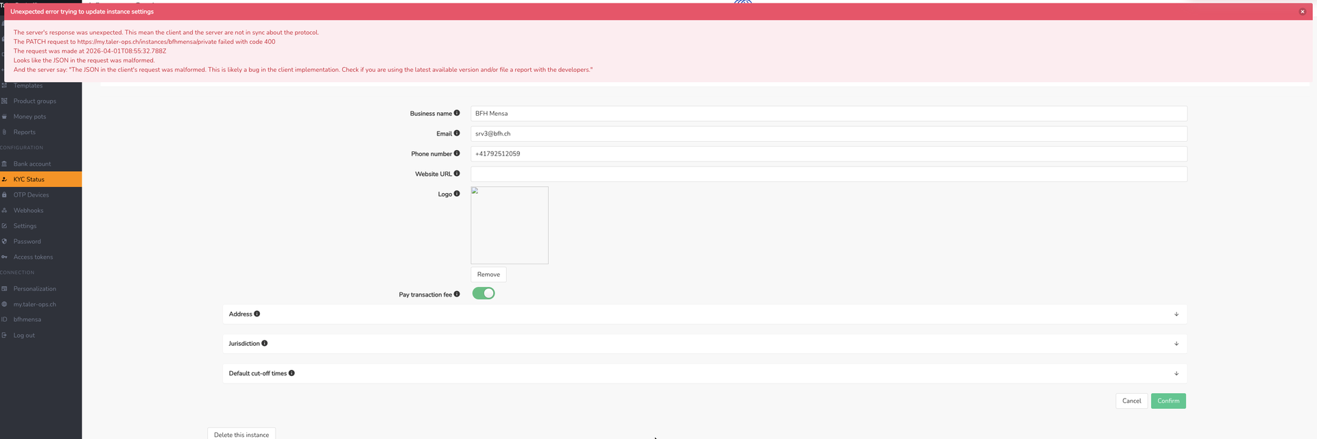 | Description | Tried to upload logo to my.taler-ops.ch, get error, see attachment. Also logo in attachment | ||||