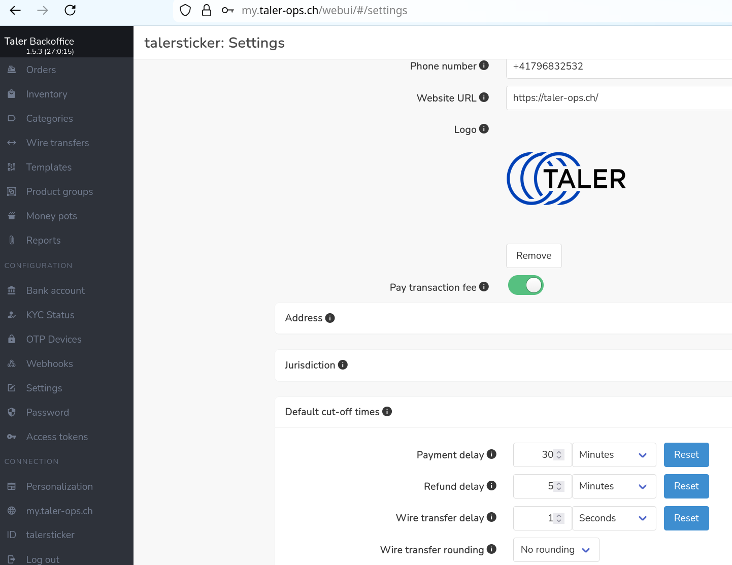 In ticket 011323, you ( @grothoff ) mention at https://bugs.gnunet.org/view.php?id=11323#c28345 that "we never talk about "cut-off delays". There is no such things. We have payment deadlines, refund deadlines, and wire deadlines". We’ve heard repeatedly from our native English speaker (BA) that “deadline” isn’t a term we should use when communicating with end users. Internally, we can of course continue to use them, but publicly we should stick to terms like “delays” and “cut-off dates,” not “deadlines.” From the merchants’ perspective, they actually experience such timeframes as delays or due dates (e.g., for final payments, for the latest possible refunds to customers, for their incoming wire transfers ...). See also the minutes of several Quality Checkpoint meetings where we stored this info in the protocol (https://cryptpad.fr/code/#/2/code/edit/RLbNfDpCt2i1lia5FM034+Oc/ and https://cryptpad.fr/code/#/2/code/edit/QhWtRWSb6-EuuGcLdgIWPsHP/). We wrote there: Terminology: "deadline" as in "wire transfer deadline" or "refund deadline" is NOT a suitable term to be used. Instead, it should sound like "cut-off time" - as recommended by Berna --> we need to discuss this topic in the suitable Mattermost channel, e.g. the Wallet channel Anyways, the settings are showing now in a scroll-down menu labelled "Default cut-off dates" {payment, refund, wire transfer} delay. Please get back to me/us if this is NOT viable for you. See the screenshot attached: |