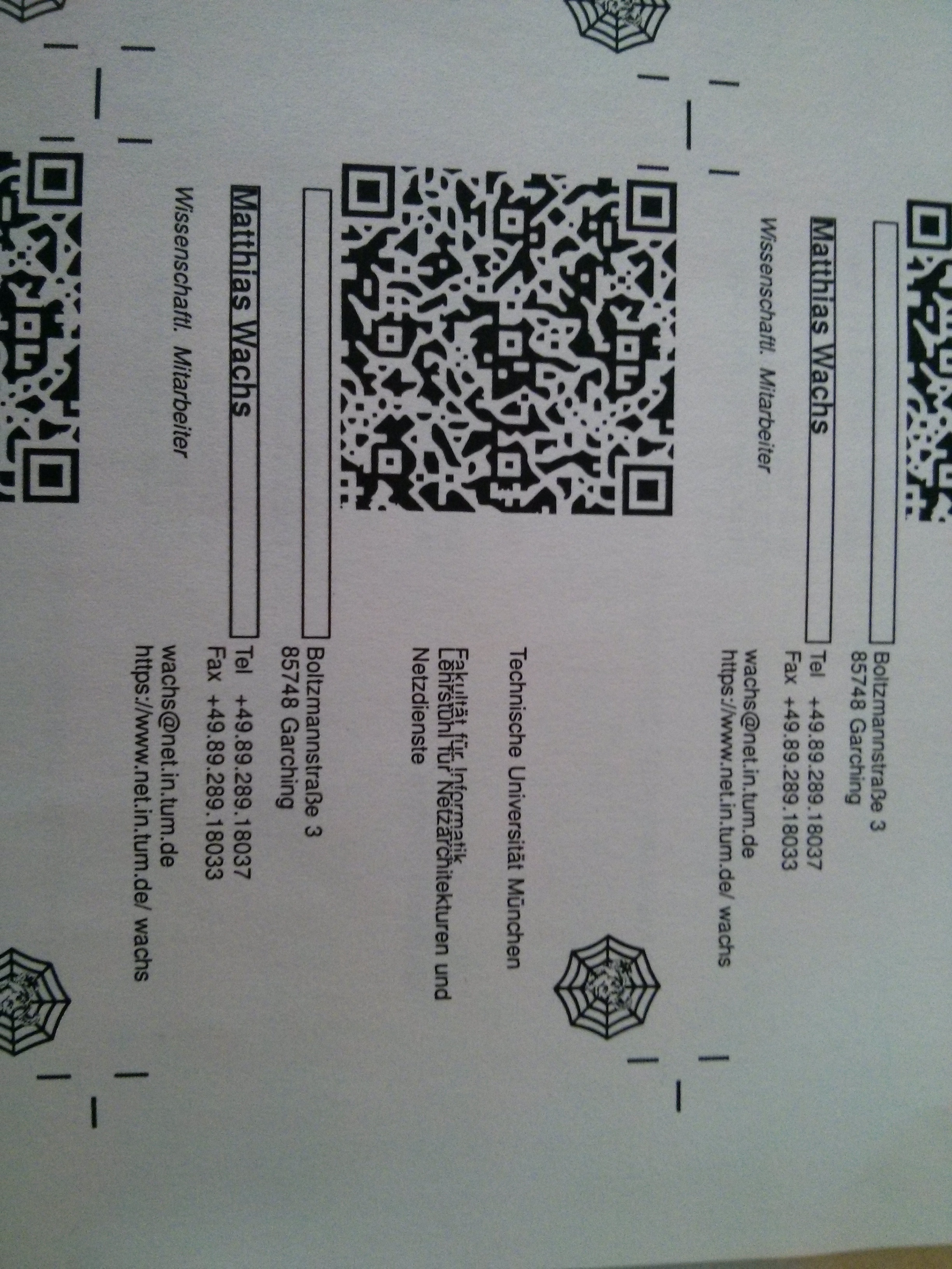 The English page was intentionally different from the German one -- it has the QR code spelled out instead. As for the QR code looking wrong, I suspect it might be your version of LaTeX, at least I don't get this... Institution/Division overlap: will have to investigate once my brain is back. |
