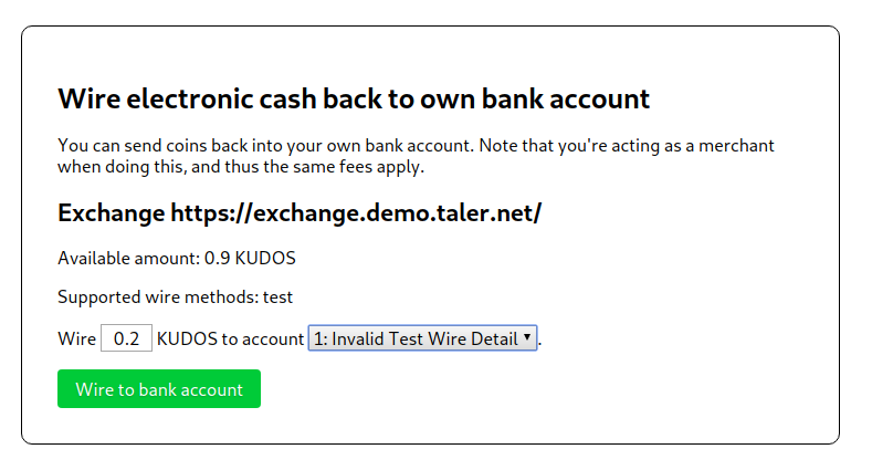 | Description | I had about 46 KUDOS in my wallet. I clicked "Return Electronic Cash to Bank Account" and set 40 to send to account Invalid Test Wire Detail (that's the only option) The 40 don't appeared in my bank account and even worse, the rest is also LOST! balance is 0!!! | ||||