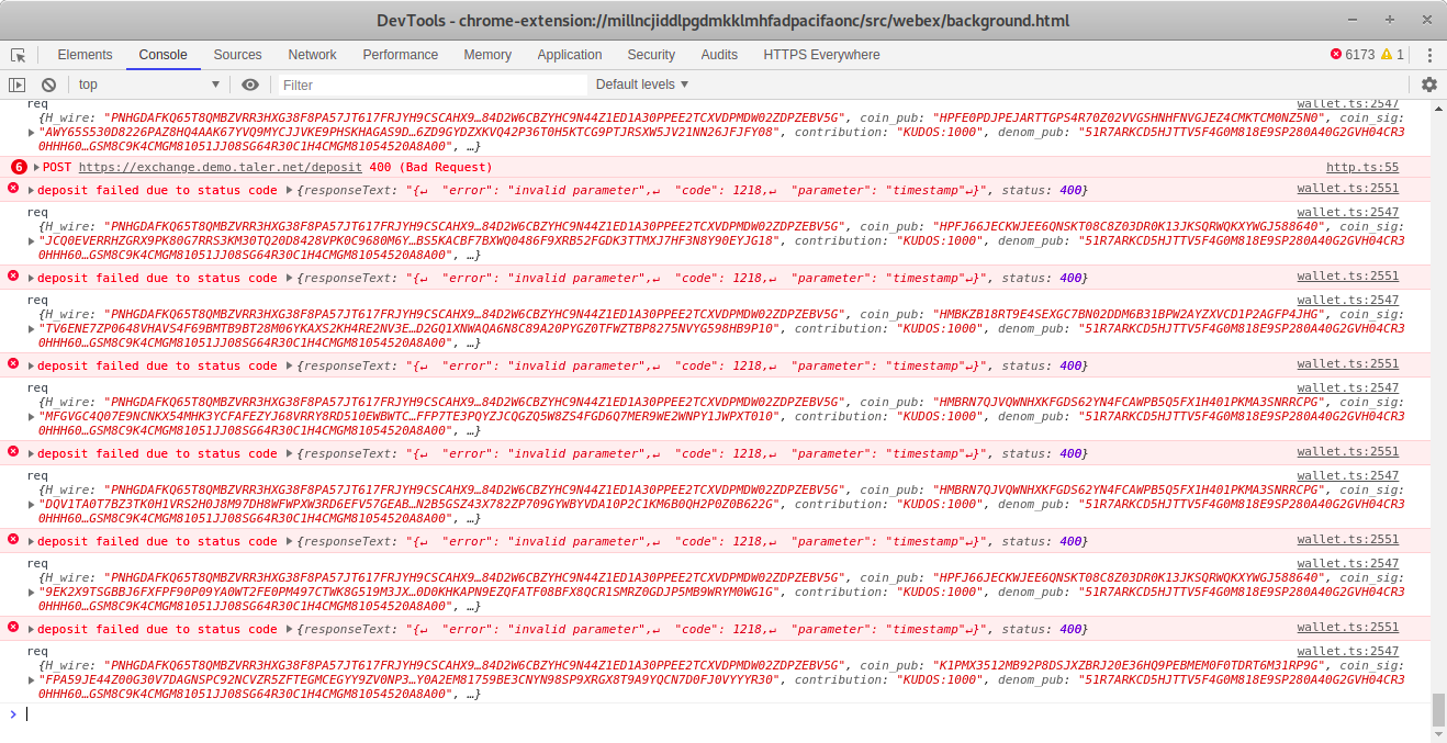 | Description | I have withdrawn a huge ammount of KUDOS from the bank into my wallet, multiple times. It don't appear directly in the wallet, but it seems that every coin is added by itself, so it takes a very long time until all this KUDOS are actually added. It appears that the wallet get stuck after adding 2000000 coins to the wallet. It starts again when i disable the browser extension and enable it again. (Since Taler should work like cash, nobody would have such amounts in ones wallet) | ||||