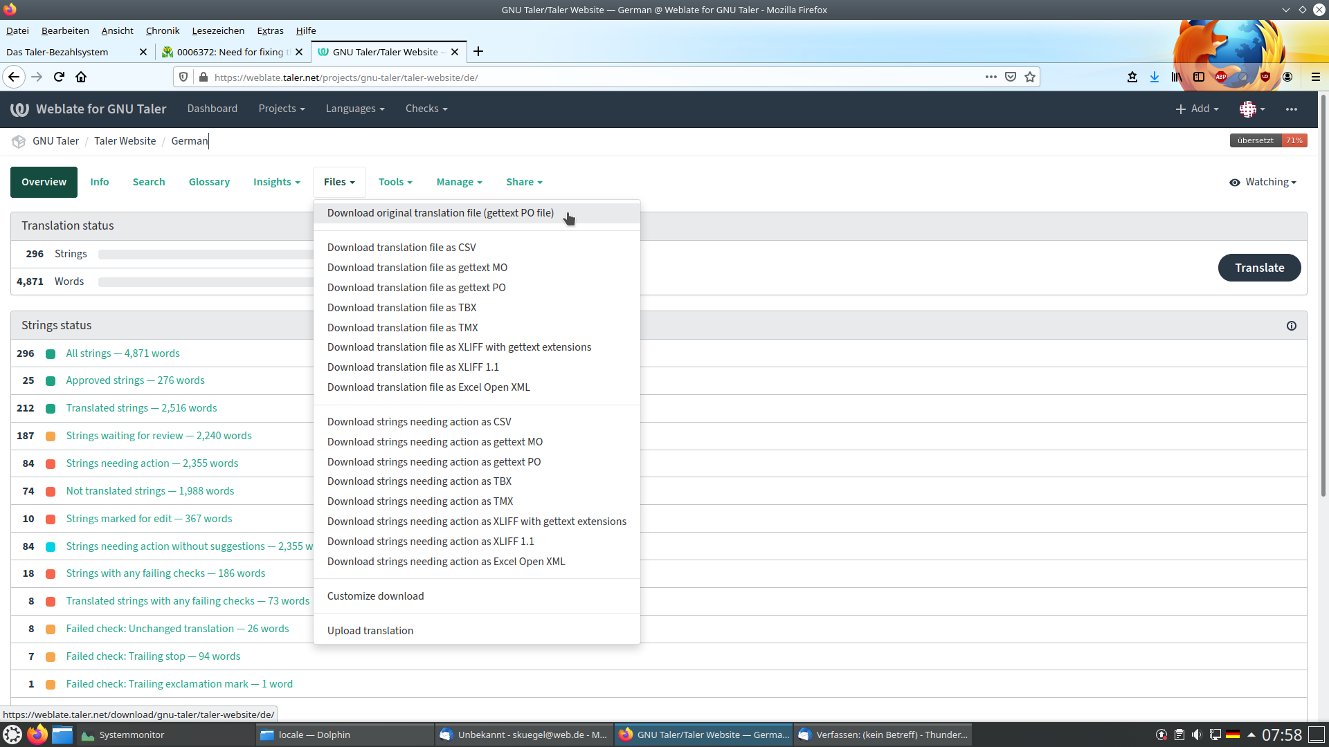 Dear Buck, Please take a look at https://stage.taler.net/de/principles.html (the staged version) and https://taler.net/de/principles.html (the live version of the website). Obviously, the are paragraphs in English and in German language mixed together. Before the change to the English master text happened (in the first days of June), all the passages on the said website were in German only. After that, some paragraphs are in English, some are in German. I can see the English master on https://git.taler.net/www.git/tree/template/principles.html.j2?h=master#n36. There are the new paragraphs in English. I can also download the translation file for German (see screenshot). But there are the old texts only displayed. What I cannot do is find the file from where the German website has its text generated. It is definitely not anymore in the git tree. I pulled the ~/www repository and have its actual version here as like it resides on the Git tree and its repos. So, take it with a smile ;-) - and let's try to find out about the 'mystery' of the German website ... I'm sure that we will unveil the secret. Cheers Stefan |