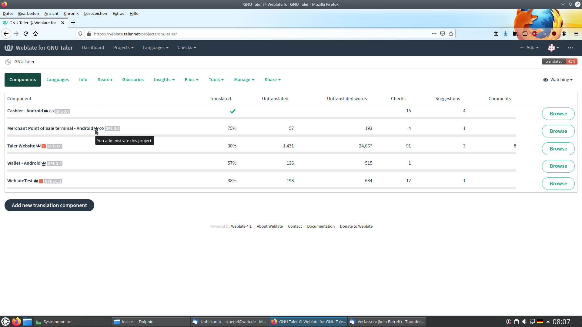 Attached you will find a screenshot of the "administration" issue (project GNU Taler and 5 components I don't want to administrate). With the 'manager' status in Weblate I want to administrate the 'Terms of Services' component only, which I am going to open on my own. Thanks for your work in advance. Kind regards Stefan |