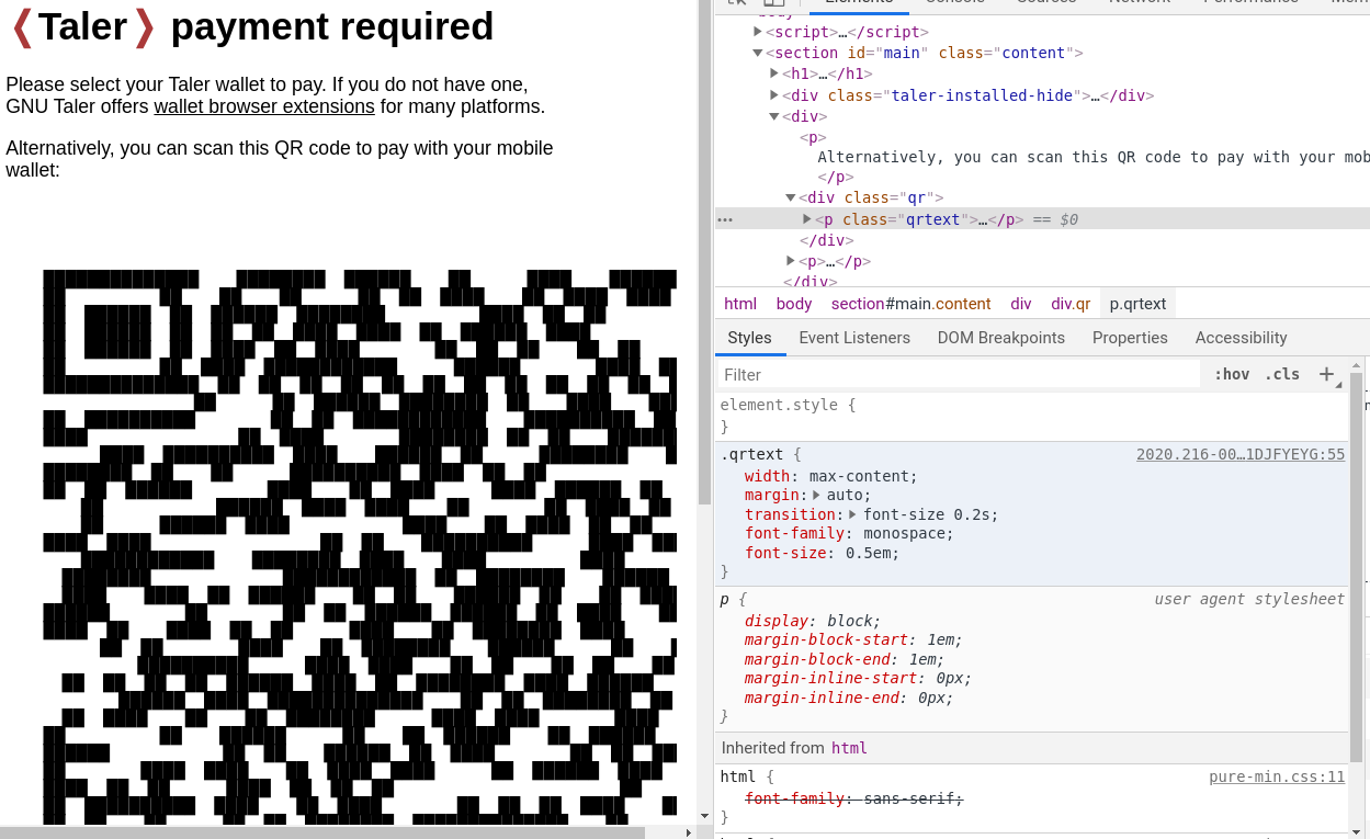 Hmm. The font-family is a "Web safe font" (aka: should be pre-installed everywhere). Also, I get your image ONLY if while I mess up the CSS syntax in that line and end up with a non-monospace font. Could it be that somehow you are not grabbing our CSS in full? Note that we (currently) "inline" the pure-min.css from a 3rd party site, which is likely broken on the backend.taler.net installation (this is on my list of things to fix). |