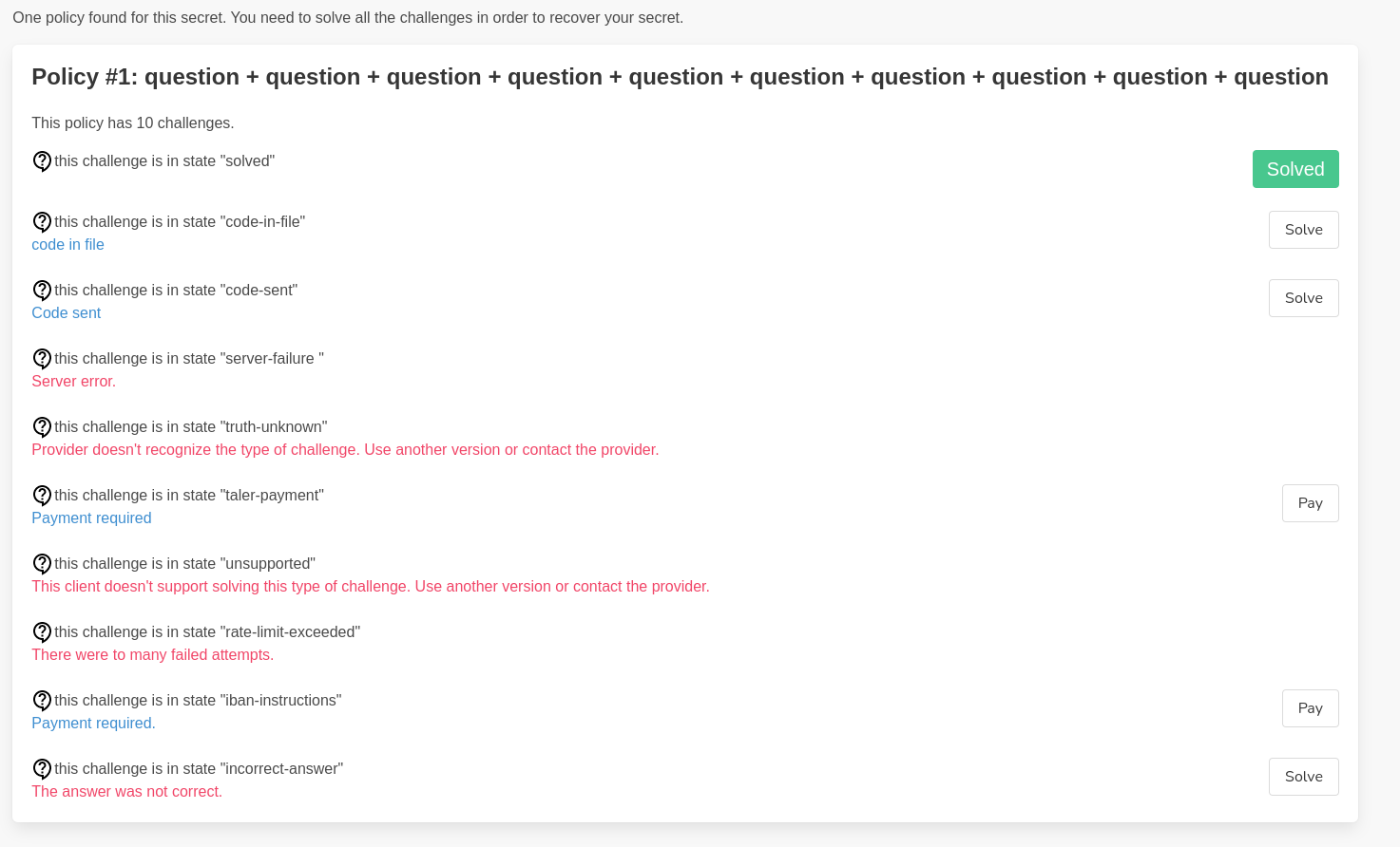 Added a message for every "ChallengeFeedbackStatus" value. There are two places where the feedback is shown: 1.- the policy overview 2.- the challenge detail for [1] messages are defined here https://git.taler.net/wallet-core.git/tree/packages/anastasis-webui/src/pages/home/ChallengeOverviewScreen.tsx#n34 I'm attaching "selection_229" as an example of a policy with challenges in every different state for [2] messages are defined here https://git.taler.net/wallet-core.git/tree/packages/anastasis-webui/src/pages/home/SolveScreen.tsx#n32 I'm attaching "selection_230" where it can be seeing that the feedback is shown as a notification, sometimes as an error (red) or info (blue) |