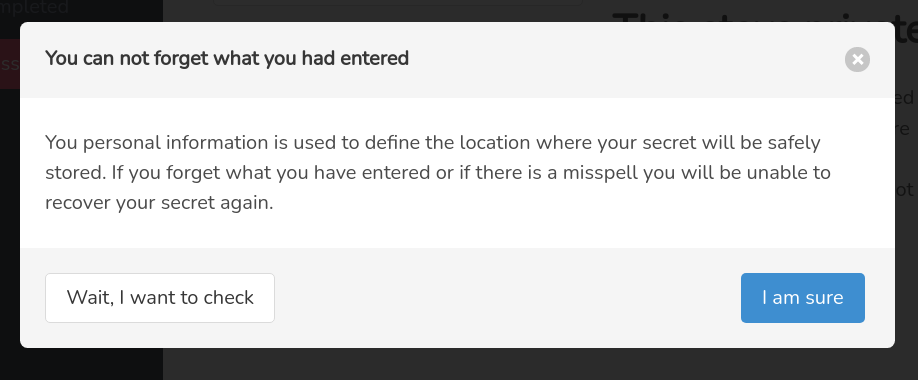 | Description | After entering the user attributes, one user suggested we should have an 'are you sure' pop-up, informing the user how important it was to provide the correct information here. | ||||