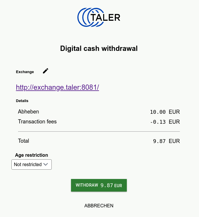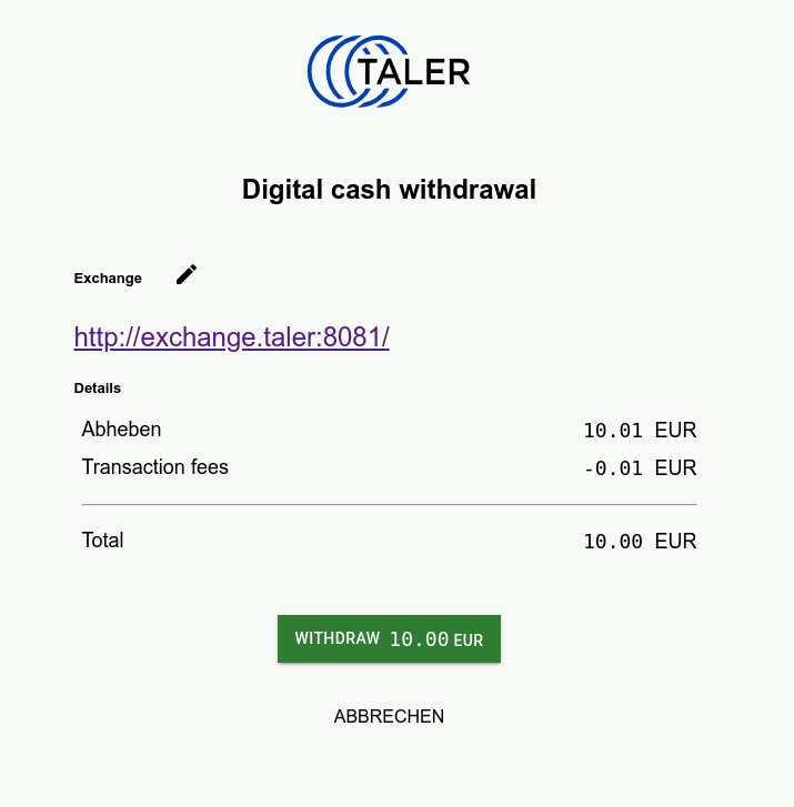 | Description | With the latest wallet webextension (commit 3577227cc0ff0f9e0c422ae34c4407d88e98ec21) there is an inconsistency with the transaction fee calculation: A withdraw amount of '10' leads to an transaction fee of '-0.13'. A (higher) withdraw amount of '10.01' leads to a transaction fee of (only) '-0.01'. Is this the result of a miscalculation or the fee-structure of the denominations? | ||||