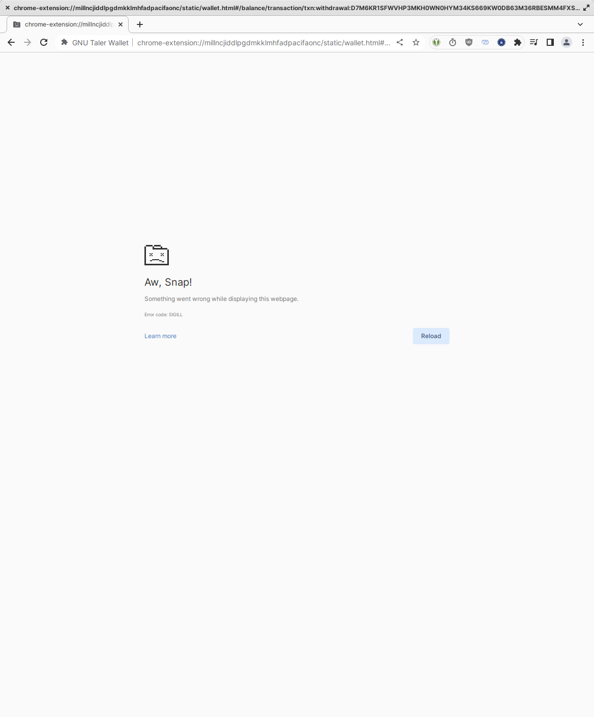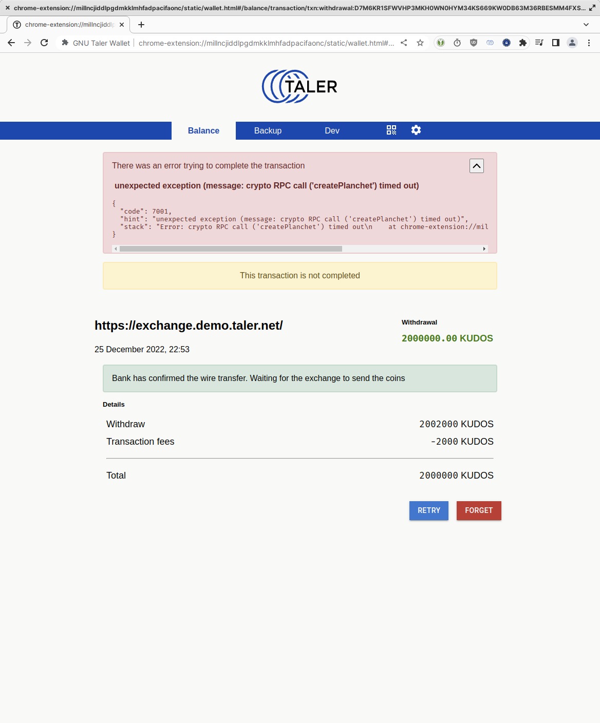 | Description | It seem to be stuck at this error: There was an error trying to complete the transaction unexpected exception (message: crypto RPC call ('createPlanchet') timed out) { "code": 7001, "hint": "unexpected exception (message: crypto RPC call ('createPlanchet') timed out)", "stack": "Error: crypto RPC call ('createPlanchet') timed out\n at chrome-extension://millncjiddlpgdmkklmhfadpacifaonc/dist/background.js:14719:18" } Related: https://bugs.gnunet.org/view.php?id=7537 So https://bugs.gnunet.org/view.php?id=5512 is not fixed. This big transactions might not be needed when the digital euro is limited to 3000 euro in the wallet and 50 euro per transaction. But with this small limits, i guess it would not get accepted... | ||||
