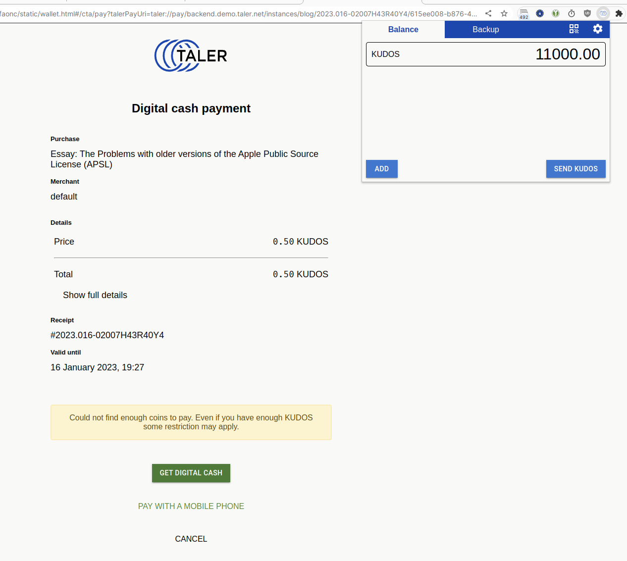 | Steps To Reproduce | 1. Open https://shop.demo.taler.net/en/ 2. Click "Pay to read more..." 3. Click on Wallet Extension and "Open pay app" 4. See Error: Could not find enough coins to pay. Even if you have enough KUDOS some restriction may apply. | ||||