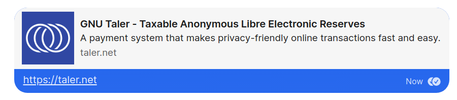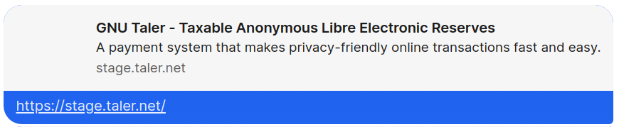 | Steps To Reproduce | Share "https://taler.net/" (or any localization) over a messenger such as Signal (what I did to test), or on a social media site like Twitter. | ||||