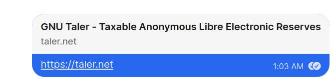 | Description | When sharing the taler.net URL in a common messaging application, or social media site, the link preview generated shows a blurry GNU favicon instead of the Taler logo, and is non-descriptive. This is due to the taler.net website lacking Open Graph[0] metadata in its HTML header. Link previews are generated using this metadata, if available. I've included a patch which fixes this, and I've attached before and after screenshots of the link preview card. SVG is not supported, so I converted the logo to PNG and attached that, as well. [0] https://ogp.me/ | ||||