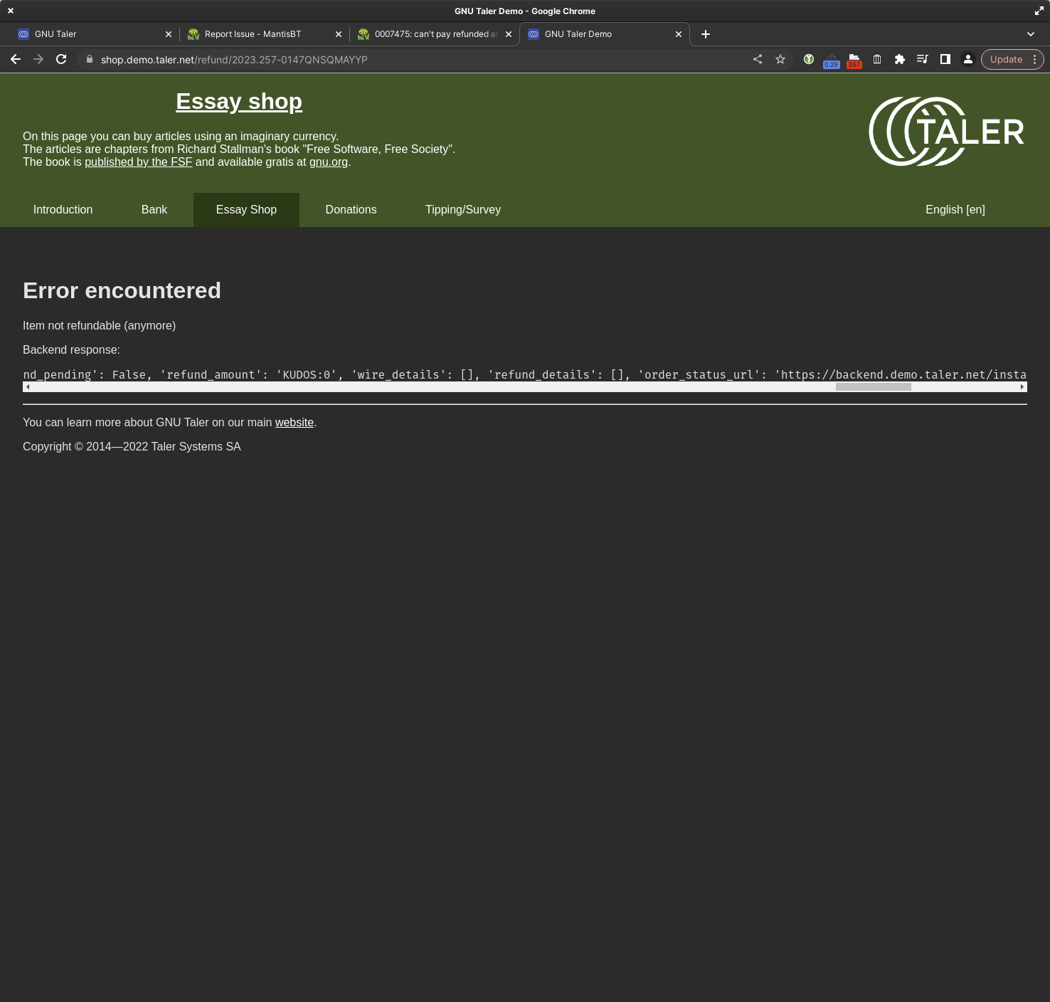| Description | Error encountered Item not refundable (anymore) Backend response: {'wire_reports': [], 'exchange_code': 0, 'exchange_http_status': 0, 'exchange_ec': 0, 'exchange_hc': 0, 'deposit_total': 'KUDOS:0', 'contract_terms': {'amount': 'KUDOS:0.5', 'extra': {'article_name': 'The_Problems_with_older_versions_of_the_Apple_Public_Source_License_-APSL-'}, 'fulfillment_url': 'https://shop.demo.taler.net/en/essay/The_Problems_with_older_versions_of_the_Apple_Public_Source_License_-APSL-', 'public_reorder_url': 'https://shop.demo.taler.net/en/essay/The_Problems_with_older_versions_of_the_Apple_Public_Source_License_-APSL-', 'summary': 'Essay: The Problems with older versions of the Apple Public Source License (APSL)', 'wire_transfer_deadline': {'t_s': 1694717108}, 'products': [], 'h_wire': 'TNZNZM4NSTGEJWPSMV8D00R8S5B6TMBKKHAWP956RTQB0KA3TAP99CWB5JGMVJJNPDK7T812VWPFHR2P3DWCZMPZQDDQSSG3MHWEQH8', 'wire_method': 'iban', 'order_id': '2023.257-0147QNSQMAYYP', 'timestamp': {'t_s': 1694716658}, 'refund_deadline': {'t_s': 1694716778}, 'pay_deadline': {'t_s': 1694720258}, 'max_wire_fee': 'KUDOS:1', 'max_fee': 'KUDOS:1', 'wire_fee_amortization': 1, 'merchant_base_url': 'https://backend.demo.taler.net/instances/blog/', 'merchant': {'name': 'GNU Taler', 'address': {}, 'jurisdiction': {}}, 'merchant_pub': 'F59GRTB78ZAX0AS77WMQWFSDKT0Z4ST5GVA86ZN9JS8DY39PXKXG', 'exchanges': [{'url': 'https://exchange.demo.taler.net/', 'priority': 1024, 'master_pub': '1SQ43RNRCB80YH58YYEH8KQKXMZNEMPA2J2CZSQN4XSWJZ40675G'}], 'nonce': 'AKH4ECWVVRNXQ9RKA1JCNQZQPHEJ8VB7RQ5ND96QN6MAN19694WG'}, 'order_status': 'paid', 'refunded': False, 'wired': False, 'refund_pending': False, 'refund_amount': 'KUDOS:0', 'wire_details': [], 'refund_details': [], 'order_status_url': 'https://backend.demo.taler.net/instances/blog/orders/2023.257-0147QNSQMAYYP?session_id=f2fa84b8-71af-4988-ad5a-02f8e1aaa040&h_contract=R0NF5B8W89383106KXRNZ2MMGC4636MD1KCSJYZ3WZGR06T3WQ083ZK1HHTMC0V7FC3WQTY9E9P93H4YGV6F9KX209AVQWFWCTD6DCG'} | ||||