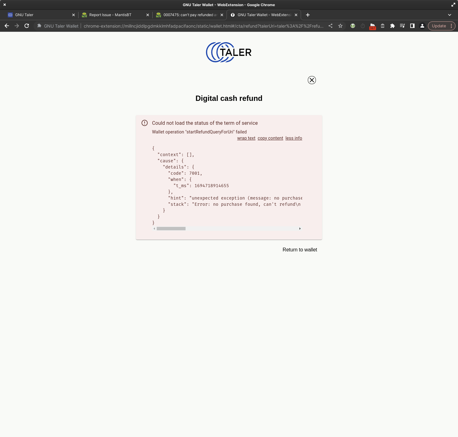 | Steps To Reproduce | 1. buy essay in demo store 2. click refund 3. the refund fails when i open the article again, it says: Taler allows merchants to offer refunds to customers. This article can't be refunded anymore. --- i tried it again with another article: same steps. but the error looks different (see second screenshot) Digital cash refund Could not load the status of the term of service Wallet operation "startRefundQueryForUri" failed less info { "context": [], "cause": { "details": { "code": 7001, "when": { "t_ms": 1694718914655 }, "hint": "unexpected exception (message: no purchase found, can't refund)", "stack": "Error: no purchase found, can't refund\n at chrome-extension://millncjiddlpgdmkklmhfadpacifaonc/dist/background.js:26437:13\n at Generator.next (<anonymous>)\n at fulfilled (chrome-extension://millncjiddlpgdmkklmhfadpacifaonc/dist/background.js:48:24)" } } } the article page says it got refunded, but i did not get the money back GIVE ME MY MONEY BACK!!! (*angry customer noise*) | ||||