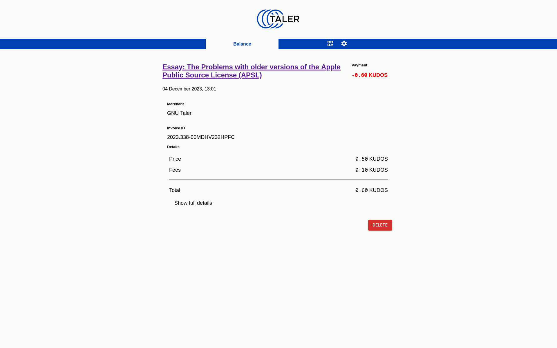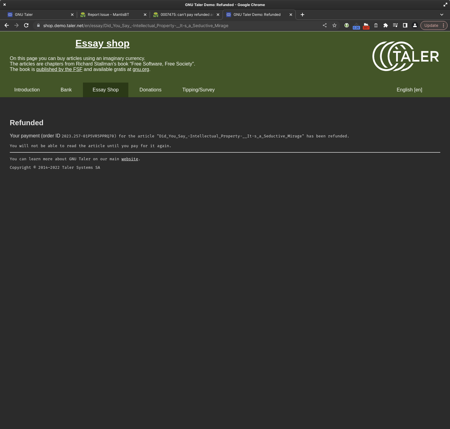 I don't see no error here. All the process went smoothly for me. Nothing weird. Working as expected. The only thing I see in the bottom of the article paid, is a message saying : "Taler allows merchants to offer refunds to customers. This article can't be refunded anymore. ". But I can understand, that is okay. |