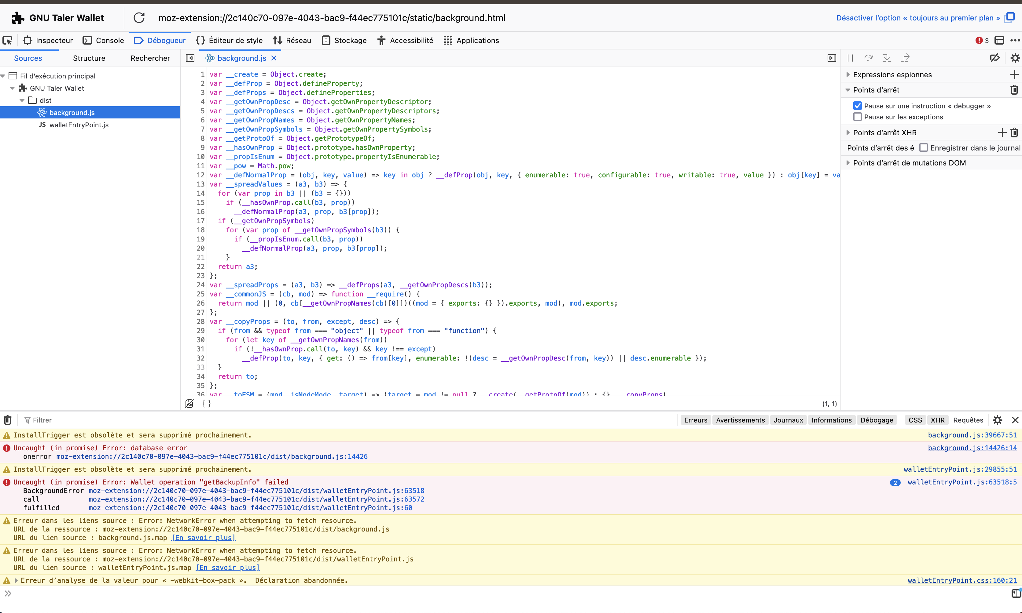 | Additional Information | As an attachement, you see inside the debugger, an error message about the database. I installed a new fresh profile on the same browser and the same action works fine. | ||||