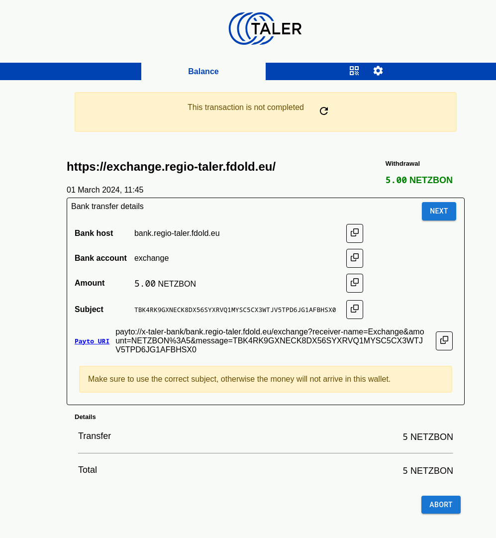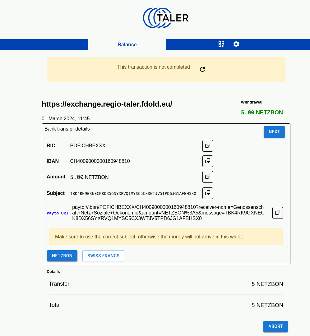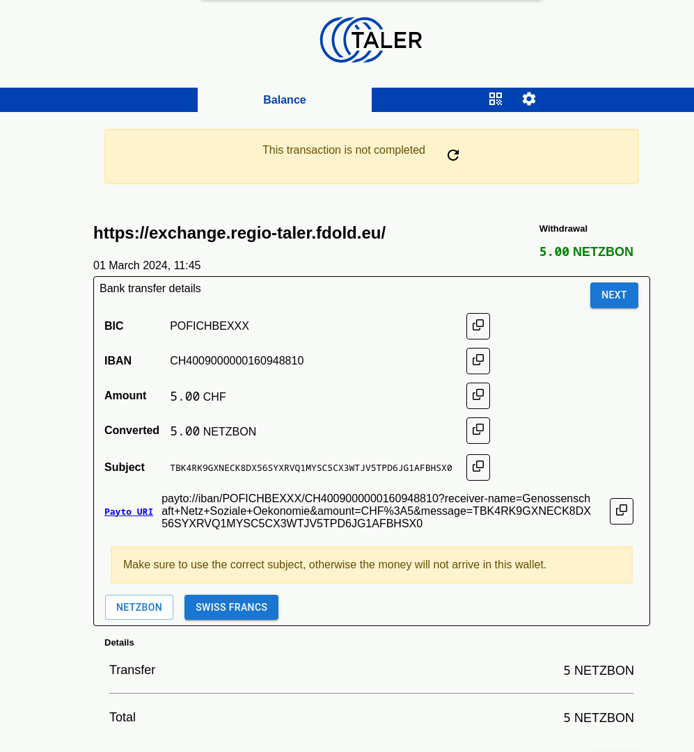 See below. * Sometimes only the "next" button is present. * Currency labels are inconsistent (different converted/amount switched) * Too much visual clutter for such an important, very user facing screen * Receiver name only in payto URI, but EU/CH banks require the user to enter it |
