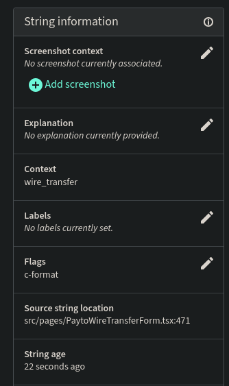 We can continue using Weblate's built-in functionality to provide and manage specific context info. As images tell more than a thousand words, images like e.g. app screenshot are preferable. Screenshots are accepted as images of up to 2000 x 2000 pixels, though. Normal screenshot dimensions from smartphones measure 1.080 x 2.400 pixels and therefore have to be cropped or scaled down each time (which is annoying when you have to manage dozens of images). I tried to add a screenshot in Weblate (https://weblate.taler.net/screenshot/1/) as an example. To upload the screenshot image (here a PNG) to Weblate's local repository I had to give it a name first ("Android_Obsolete_button_text") and then I could assign it to a plurality of English source strings. Of course, I had to choose the relevant strings. For this purpose, there are two buttons: "Search" for a manual search to find a source string and "Automatically recognize". I better advice to do the manual search and work with keywords that match with the variables in the app's source code. It is a good deal to look at the source code in the app to be sure about the context of a string. Finally, I assigned the PNG image to two neighboring strings (https://weblate.taler.net/translate/gnu-taler/wallet-android/de/?checksum=676048a43301cbd9 with the key 'withdraw_button_confirm_bank', https://weblate.taler.net/translate/gnu-taler/wallet-android/de/?checksum=f84259af8c116559 which has the key 'withdraw_button_confirm'). Conclusion: String attributes like message ID or location in the source code are our best orientation right after screenshots whereas context (msgctxt) is a nice-to-have but not very reasonable for our rather tiny projects with only few doublets in apps that are relatively easy to overlook and differentiate. We better leave it as is and renounce on the msgctxt pogen feature. |