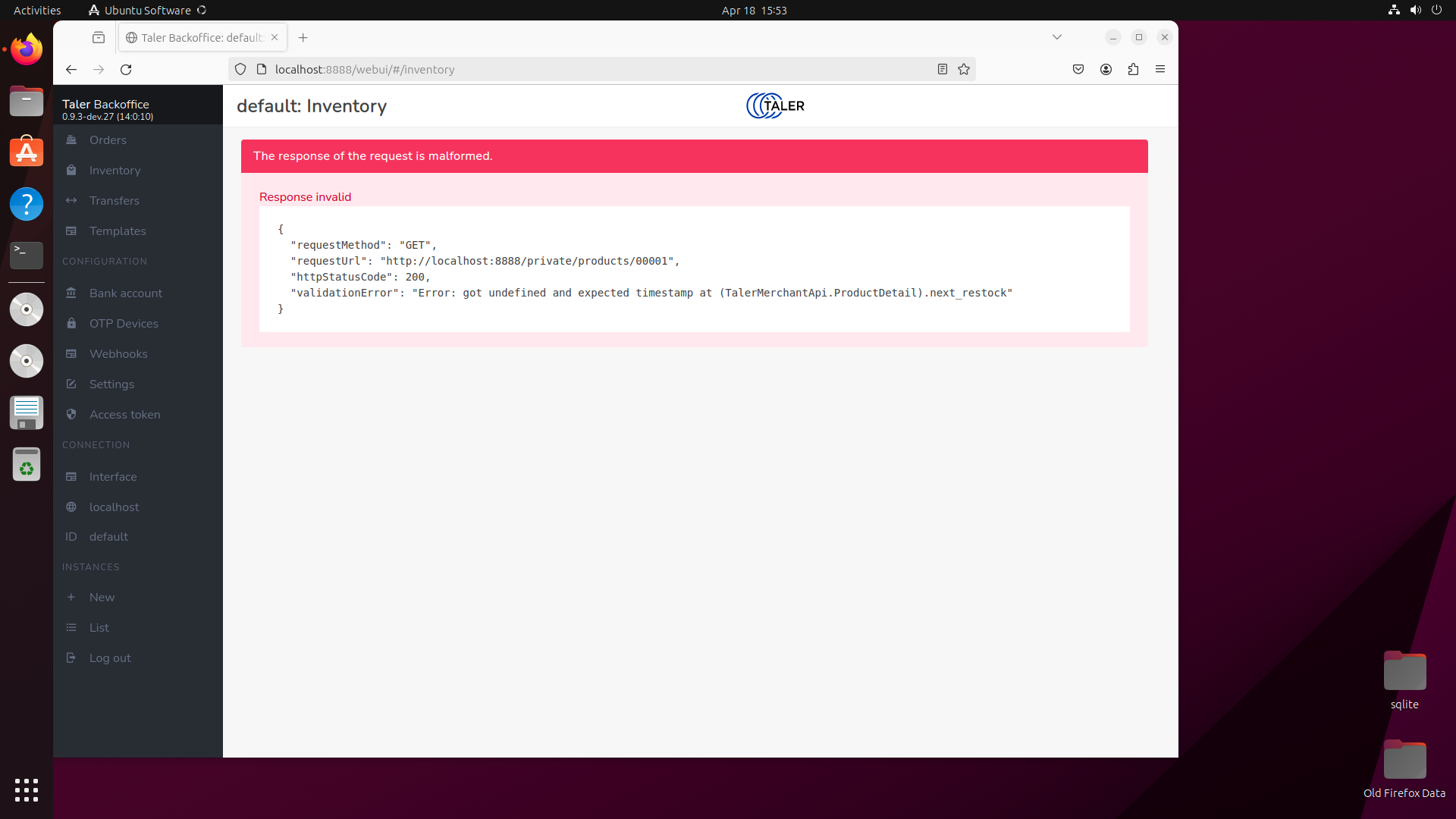 this is a very old installation SPA 0.9.3-dev.27 from Wed Sep 27 merchant server v14 and between that version and current one (0.12.12) there has been many updated and fixed, specially in the API (v17) I can't reproduce it, could you do it now? > and get a cryptic JSON error message What do you suggest for a better message here? the title says: the response of the request is malformed then the information of the request and why is malformed is there, the client expected some value in a field and the server did respected the protocol. This was due some protocol misalignment (client or server, i don't know) but it think is pretty clear, suggestion are welcome. > Usability could be improved (front end error message). > I can not do anything in the inventory anymore (JSON error also). Yes, i will try to reproduce this type of error to see why it didn't recover. |