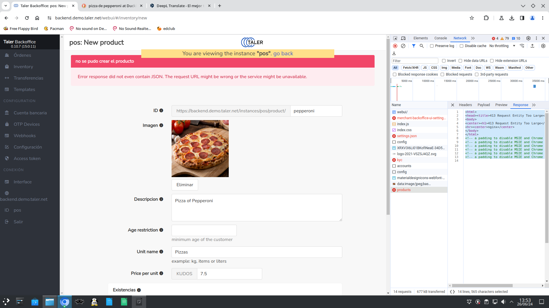 | Description | At one point I tried to create a product with a large image, but with that specific image it gave me an error, and it didn't tell me that it had exceeded the space limit, it simply didn't save the product, this was the error: { "code": 26, "hint": "A parameter in the request was malformed. This is likely a bug in the client implementation. Check if you are using the latest available version and/or file a report with the developers.", "detail": "image" } In this case, I placed an image with a file size smaller than the 1MB limit imposed by the SPA, at around 700kB, however, when I added the image, the SPA didn't let me save the product, throwing this response in the console: <html> <head><title>413 Request Entity Too Large</title></head> <body> <center><h1>413 Request Entity Too Large</h1></center> <hr><center>nginx</center> </body> </html> <!-- a padding to disable MSIE and Chrome friendly error page --> <!-- a padding to disable MSIE and Chrome friendly error page --> <!-- a padding to disable MSIE and Chrome friendly error page --> <!-- a padding to disable MSIE and Chrome friendly error page --> <!-- a padding to disable MSIE and Chrome friendly error page --> <!-- a padding to disable MSIE and Chrome friendly error page --> | ||||