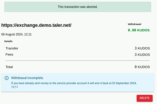 | Description | The transaction details now include the withdrawalDetails.reserveClosingDelay field (for manual withdrawals only). This duration should be shown to the user when a withdrawal was aborted, with a message like: ``` The withdrawal was aborted. If you have already sent money to the exchange, it will wire it back in $X days. ``` | ||||