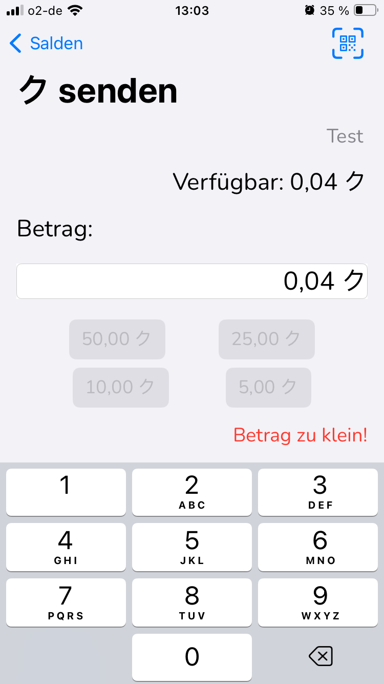 | Description | If one sends a very small amount, there is an error "Betrag zu klein", but no hint what is the smallest amount. | ||||