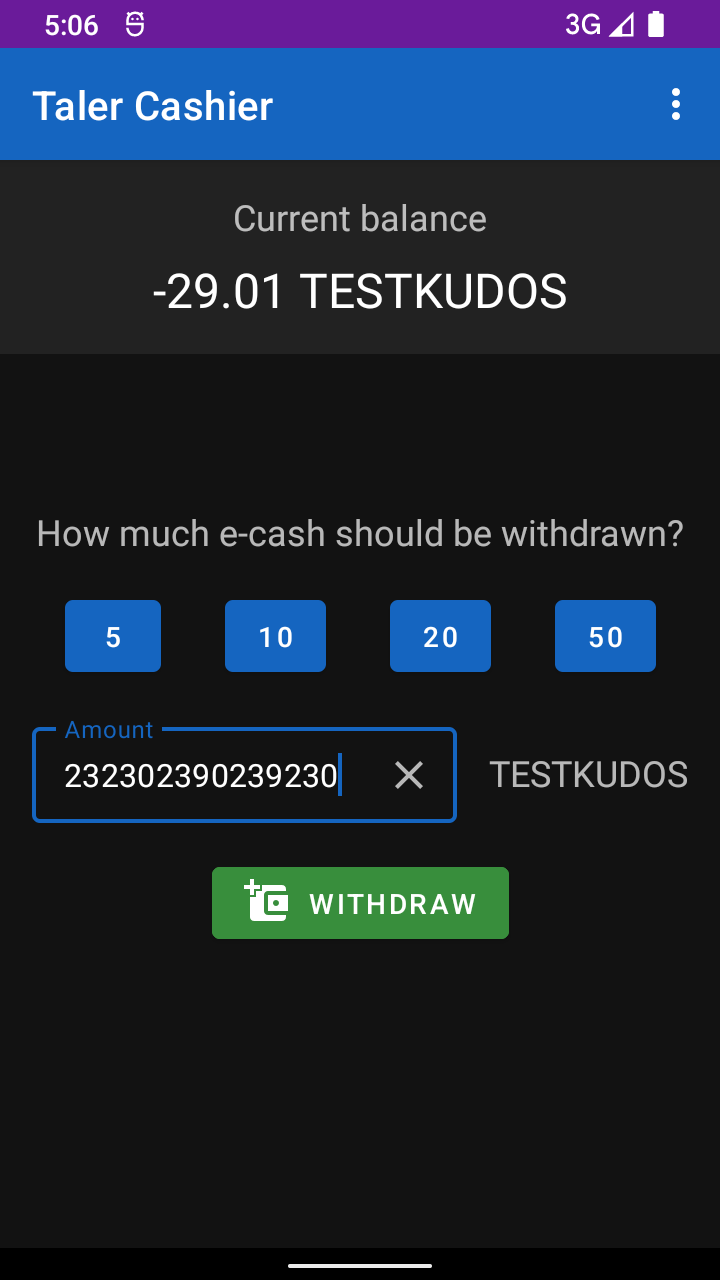 | Steps To Reproduce | 1. Open Taler Cashier 2. Login with some bank account 3. input an amount with at least two digits into the form 4. see that one does not see the whole amount | ||||